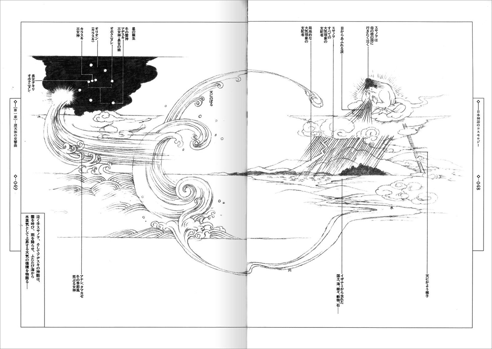 日本における構造主義の紹介者として知られた著者による、日本神話の解体的(あるいは創造的)な読み直し。 歴史的考証を主役とする従来の日本神話研究に加え、四季のうつろいが織りなす星辰の動き、動・植物の息づかい、詩歌・文芸に盛りこまれた心の動きを重ねあわせ、読み解いたもの。 対話形式による本文に併走する豊富なイラストとユニークな図解は、杉浦や渡辺冨士雄を中心とするスタッフによって描き下ろされた。通常の本文と挿図の関係を超えたテキストと図版の有機的コラボレーション。 挿画=渡辺冨士雄+武田育雄+西口司郎; 協力=谷村彰彦 四、脈動する本 文字|図像+テキスト(絵物語りを生みだす) |