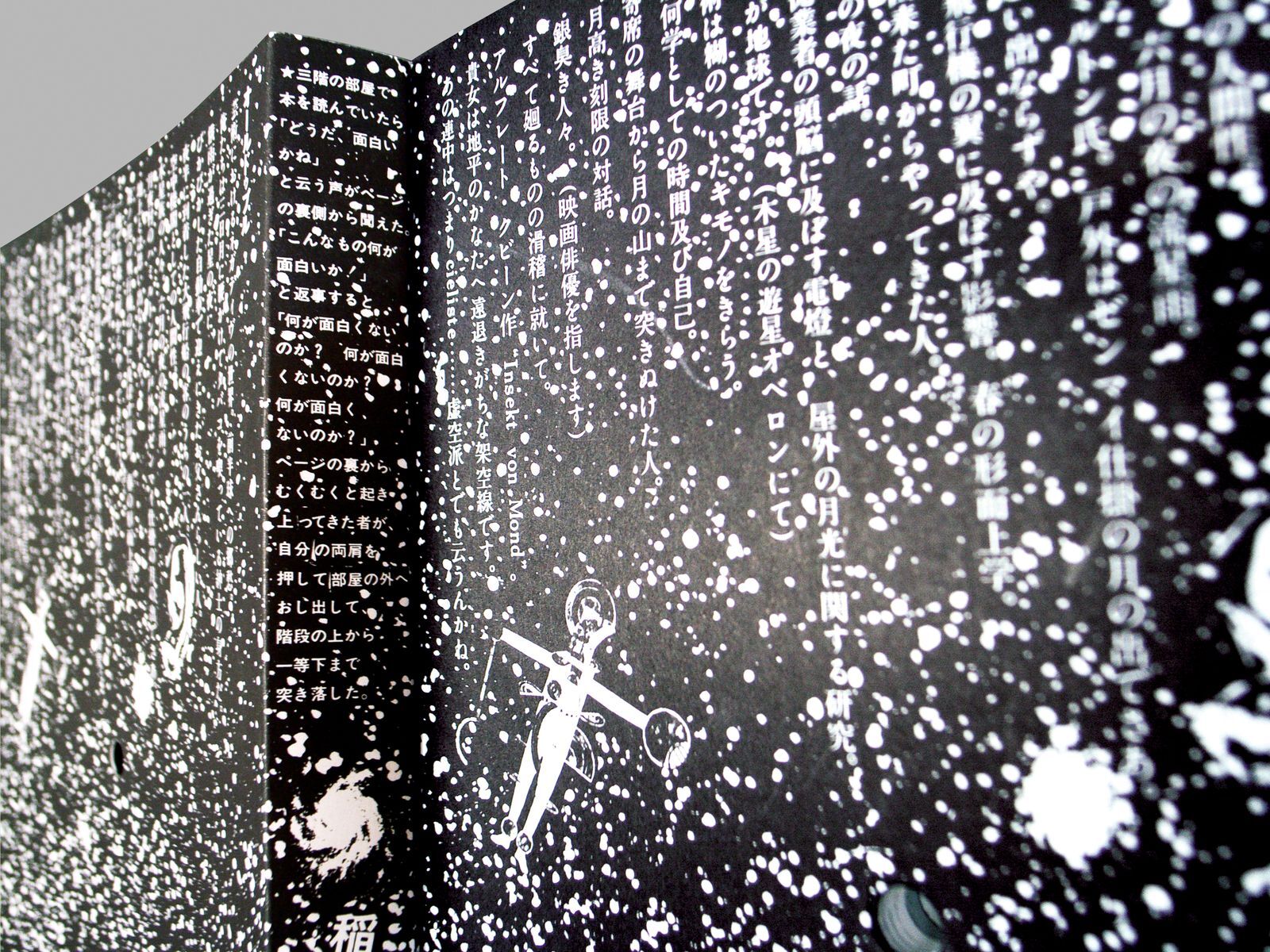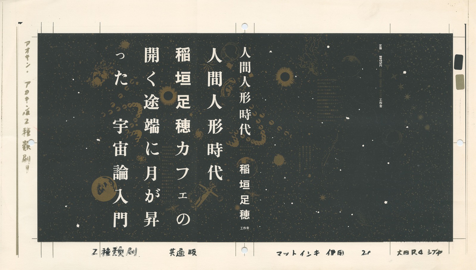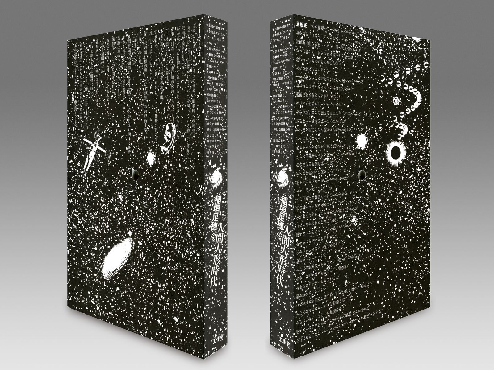 松岡正剛が編集し、杉浦がデザインしたオブジェ・ブック。著者の「人間=腔腸動物」説にしたがい中心に一つの孔を穿たれて、腔腸動物化した本となる。この孔は同時に、表紙の背景を包みこむ宇宙空間のブラックホールにも見立てられた。 本表紙の背に収まった、極小短篇の書きこみや、初版刊行時の1975年に、定価を1975円にした……ということなど随所に楽しい仕掛けが隠されている。 ブリキオモチャのオブジェ図像が浮遊する、第1部。マイブリッジと宇宙線が交錯する、第2部の本編。第3部「宇宙論入門」には、宇宙百科がちりばめられる……。 全ページにあふれる遊戯的過剰は、星屑を愛する著者の想像力にそったもの。ノイズにみちた銀河大宇宙の中に、浮遊する。 小説「人間人形時代」の組版を囲むマイブリッジの連続写真。フリッカー仕掛けでマルチスクリーン動画を生成する。 宇宙線の軌跡がオーバーラップし、動く身体を透過する。 協力=中垣信夫+海保透 五、ノイズから生まれる カバー表紙|(ショート・ショート)吹きよせ 本文|(フリッカー(動き)) |