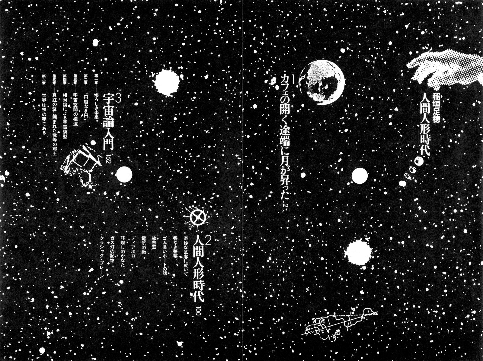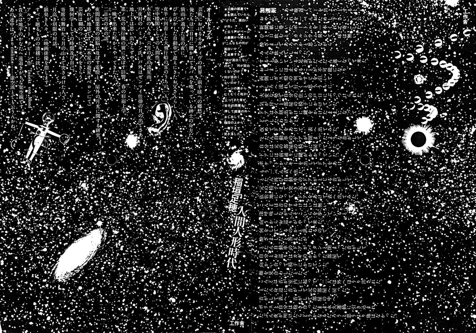 松岡正剛が編集し、杉浦がデザインしたオブジェ・ブック。著者の「人間=腔腸動物」説にしたがい中心に一つの孔を穿たれて、腔腸動物化した本となる。この孔は同時に、表紙の背景を包みこむ宇宙空間のブラックホールにも見立てられた。 本表紙の背に収まった、極小短篇の書きこみや、初版刊行時の1975年に、定価を1975円にした……ということなど随所に楽しい仕掛けが隠されている。 ブリキオモチャのオブジェ図像が浮遊する、第1部。マイブリッジと宇宙線が交錯する、第2部の本編。第3部「宇宙論入門」には、宇宙百科がちりばめられる……。 全ページにあふれる遊戯的過剰は、星屑を愛する著者の想像力にそったもの。ノイズにみちた銀河大宇宙の中に、浮遊する。 小説「人間人形時代」の組版を囲むマイブリッジの連続写真。フリッカー仕掛けでマルチスクリーン動画を生成する。 宇宙線の軌跡がオーバーラップし、動く身体を透過する。 協力=中垣信夫+海保透 五、ノイズから生まれる カバー表紙|(ショート・ショート)吹きよせ 本文|(フリッカー(動き)) |