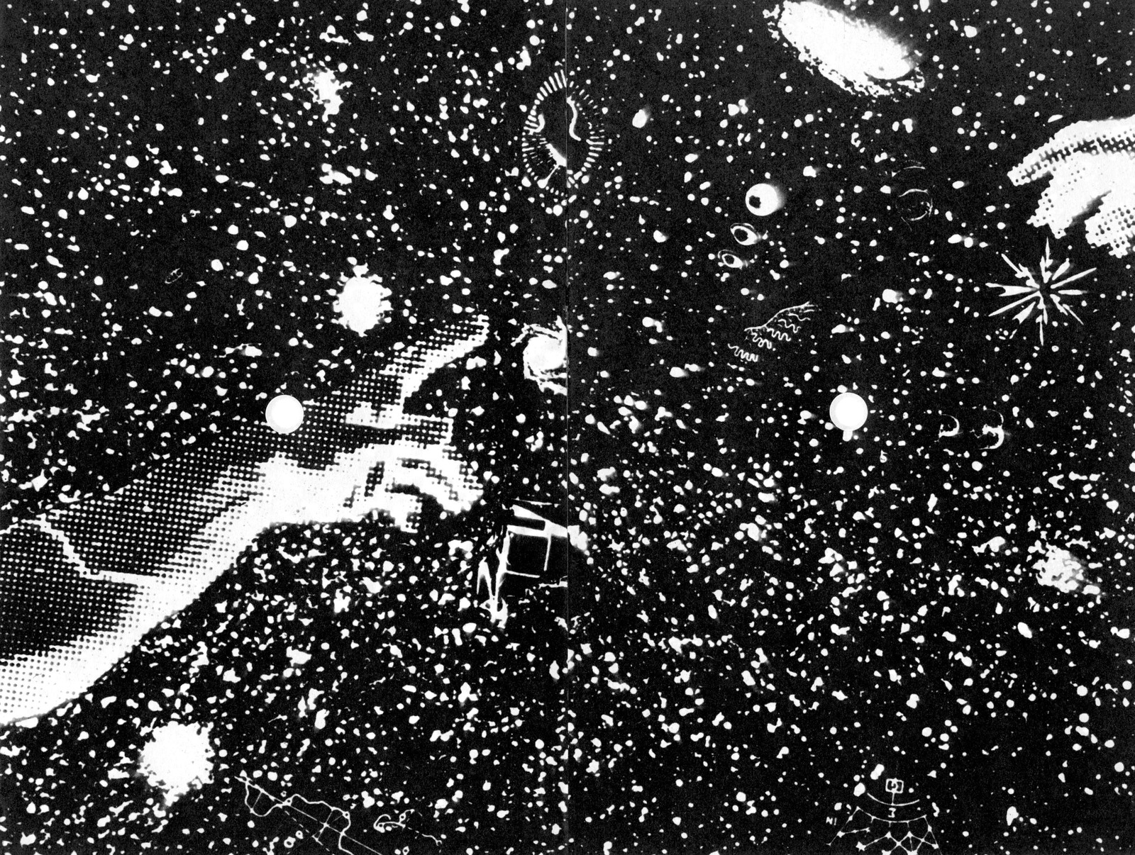 松岡正剛が編集し、杉浦がデザインしたオブジェ・ブック。著者の「人間=腔腸動物」説にしたがい中心に一つの孔を穿たれて、腔腸動物化した本となる。この孔は同時に、表紙の背景を包みこむ宇宙空間のブラックホールにも見立てられた。 本表紙の背に収まった、極小短篇の書きこみや、初版刊行時の1975年に、定価を1975円にした……ということなど随所に楽しい仕掛けが隠されている。 ブリキオモチャのオブジェ図像が浮遊する、第1部。マイブリッジと宇宙線が交錯する、第2部の本編。第3部「宇宙論入門」には、宇宙百科がちりばめられる……。 全ページにあふれる遊戯的過剰は、星屑を愛する著者の想像力にそったもの。ノイズにみちた銀河大宇宙の中に、浮遊する。 小説「人間人形時代」の組版を囲むマイブリッジの連続写真。フリッカー仕掛けでマルチスクリーン動画を生成する。 宇宙線の軌跡がオーバーラップし、動く身体を透過する。 協力=中垣信夫+海保透 五、ノイズから生まれる カバー表紙|(ショート・ショート)吹きよせ 本文|(フリッカー(動き)) |
