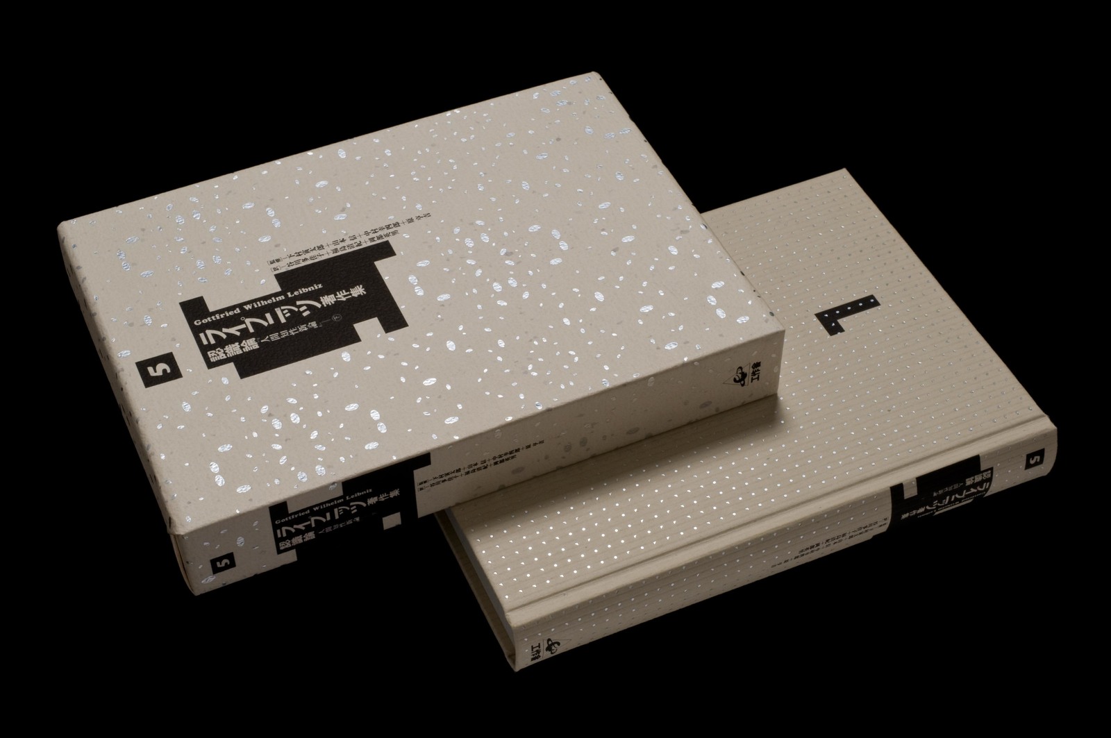 17世紀、「普遍数学」をかかげてバロック期の科学革命をリードしたライプニッツの著作集。10段階に変化するタイトル図形が、哲人の思想遍歴を象徴する。 ●と▲。二つの図形をランダムに並べながら、7×7のマトリクスを作り、それを、点対称で増殖させる……という手法で作りあげた、「ランダム←→規則的」ユニットパターン。 表紙デザインでは、このパターンを縮小し、横方向に4回、縦方向に6回、鏡像反転させて作りあげた24ユニットのシンメトリーパターンを銀色の箔で押している。 箔押しをすると、▲や●の微妙に凹んだ部分が入射光の角度を反映して、異なるきらめきを発し、一つ一つのユニットが浮かびあがる。規則的で風変りな、箔押し効果が生まれでた。 記号論理学や微積分の創始、二進法の研究など、数々の数学的発想で知られる、ライプニッツ。予見にみちた巨人へのオマージュである。 箱のデザインにも、箔押しが使われた。これも、鏡面対象のパターンによるデザイン。 題字まわりの黒枠は、平が5×7の格子構造。背は、5×9の格子となる。巻を追って、外郭の形が微妙な変化を見せる。 協力=谷村彰彦 五、ノイズから生まれる シリーズ全集|(ノイズで装う) シリーズ全集|(背)をデザインする(ギャラリー) カバー表紙|箔・キラキラ本 |
