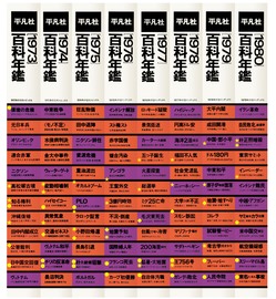 1973年から、『世界大百科事典』の補足資料として毎年刊行された、『百科年鑑』。表紙・本文には多様なオリジナル・ダイアグラムを収録。 一年間の各ジャンルにわたる詳細なデータ記録が、評論とともに網羅された。背には、その年の12大ニュースが国内・世界の2色の色分けで網羅され、書棚に並べると、年ごとの出来事の推移と消長を知ることができる。背の記号が示す数値指標は、年ごとに推移する折れ線グラフを出現させて、世界と日本人の生活の動向を物語る。 協力=中垣信夫+鈴木一誌+谷村彰彦+赤崎正一[ほか] 六、本の地層学 シリーズ全集|(背)をデザインする(目次・年表・暗号化) |