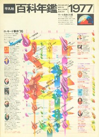 1973年から、『世界大百科事典』の補足資料として毎年刊行された、『百科年鑑』。表紙・本文には多様なオリジナル・ダイアグラムを収録。 一年間の各ジャンルにわたる詳細なデータ記録が、評論とともに網羅された。背には、その年の12大ニュースが国内・世界の2色の色分けで網羅され、書棚に並べると、年ごとの出来事の推移と消長を知ることができる。背の記号が示す数値指標は、年ごとに推移する折れ線グラフを出現させて、世界と日本人の生活の動向を物語る。 協力=中垣信夫+鈴木一誌+谷村彰彦+赤崎正一[ほか] 六、本の地層学 シリーズ全集|(背)をデザインする(目次・年表・暗号化) |
