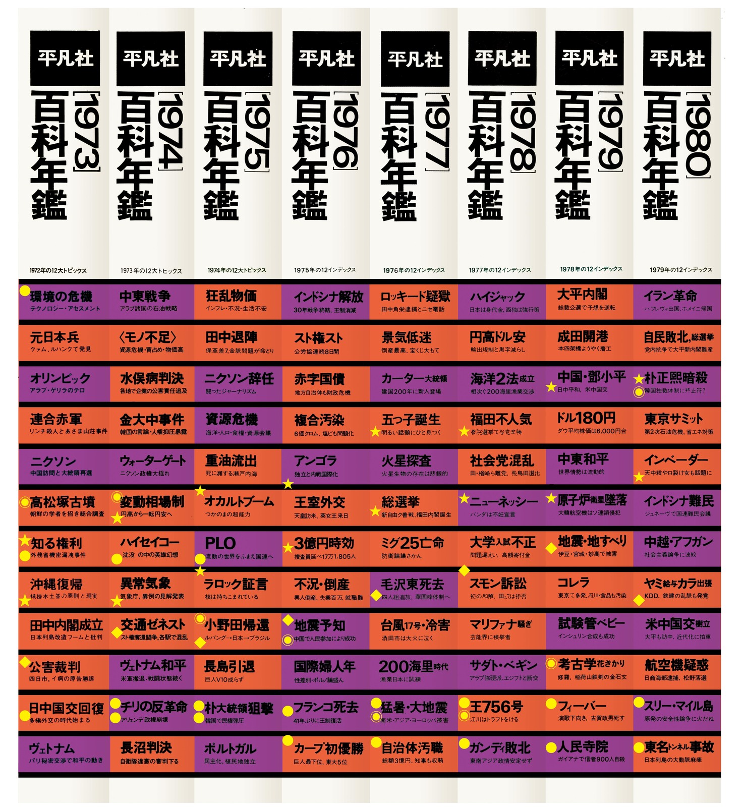 1973年から、『世界大百科事典』の補足資料として毎年刊行された、『百科年鑑』。表紙・本文には多様なオリジナル・ダイアグラムを収録。