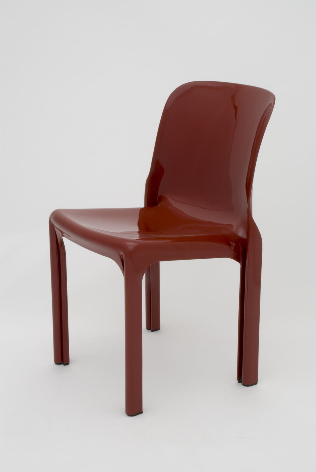 当時、新素材であるプラスチックの利用で新しい世界を切り開いたアルテミデ社によってつくられたこの椅子は、いくつかの工夫を施しており、脚を軽く、丈夫に、それでいて細くしようと試みている。なお背や座から脚へ流れてくる面の連続性も考えて、断面を『N字型』にして前後左右の歪みをなくしている。また後脚に対して左右の前脚の間隔を狭め、スタッキングを可能にしている。スタッキングのためのディティールの苦労がみられる椅子である。このスタイルでアーム付きのタイプや、もう少し座の低い休息用の椅子もつくっている。 |