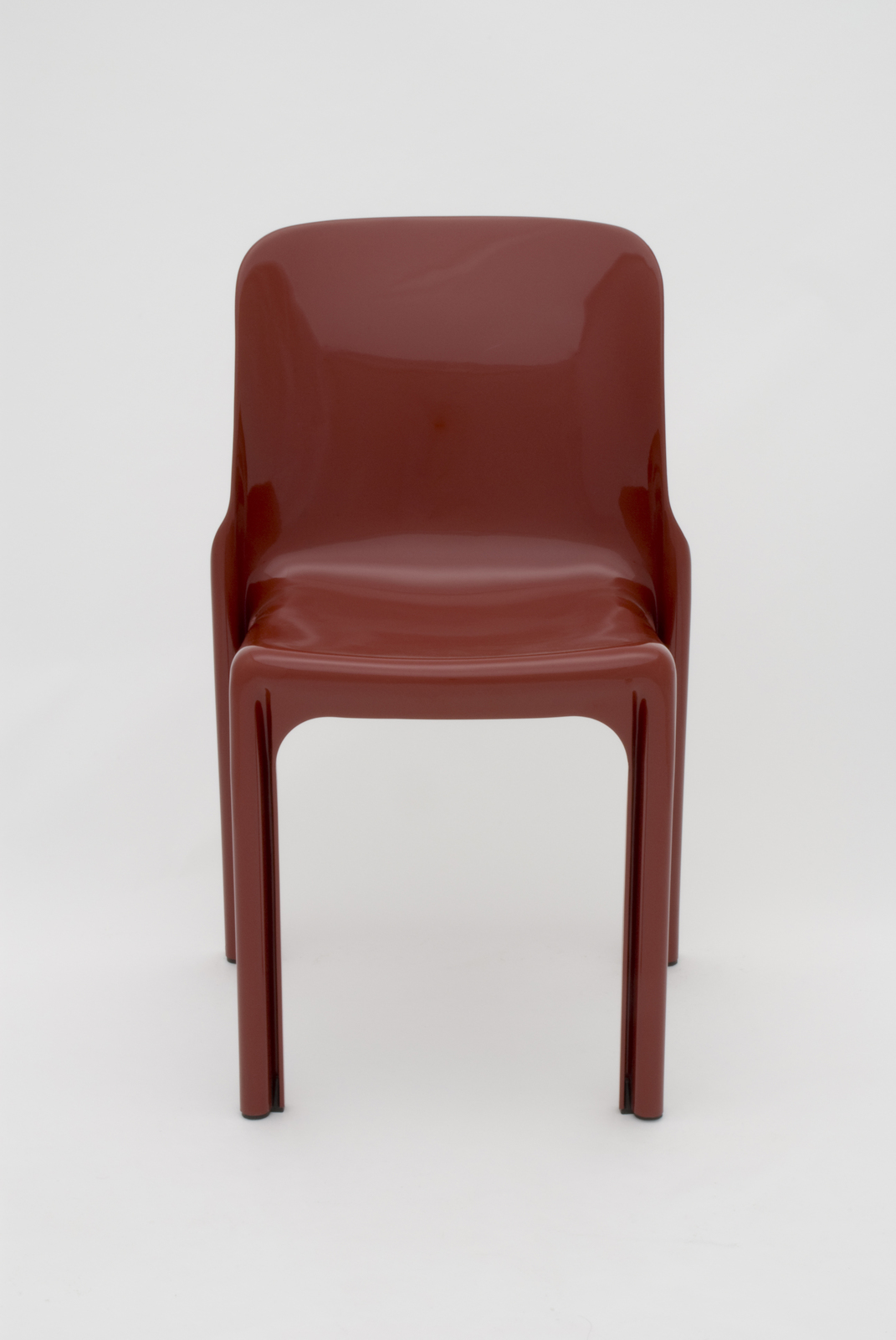 当時、新素材であるプラスチックの利用で新しい世界を切り開いたアルテミデ社によってつくられたこの椅子は、いくつかの工夫を施しており、脚を軽く、丈夫に、それでいて細くしようと試みている。なお背や座から脚へ流れてくる面の連続性も考えて、断面を『N字型』にして前後左右の歪みをなくしている。また後脚に対して左右の前脚の間隔を狭め、スタッキングを可能にしている。スタッキングのためのディティールの苦労がみられる椅子である。このスタイルでアーム付きのタイプや、もう少し座の低い休息用の椅子もつくっている。 |