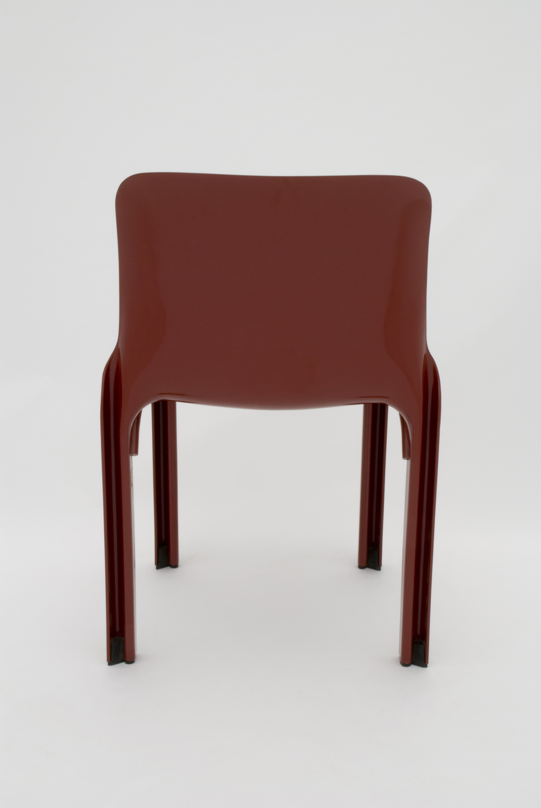 当時、新素材であるプラスチックの利用で新しい世界を切り開いたアルテミデ社によってつくられたこの椅子は、いくつかの工夫を施しており、脚を軽く、丈夫に、それでいて細くしようと試みている。なお背や座から脚へ流れてくる面の連続性も考えて、断面を『N字型』にして前後左右の歪みをなくしている。また後脚に対して左右の前脚の間隔を狭め、スタッキングを可能にしている。スタッキングのためのディティールの苦労がみられる椅子である。このスタイルでアーム付きのタイプや、もう少し座の低い休息用の椅子もつくっている。 |