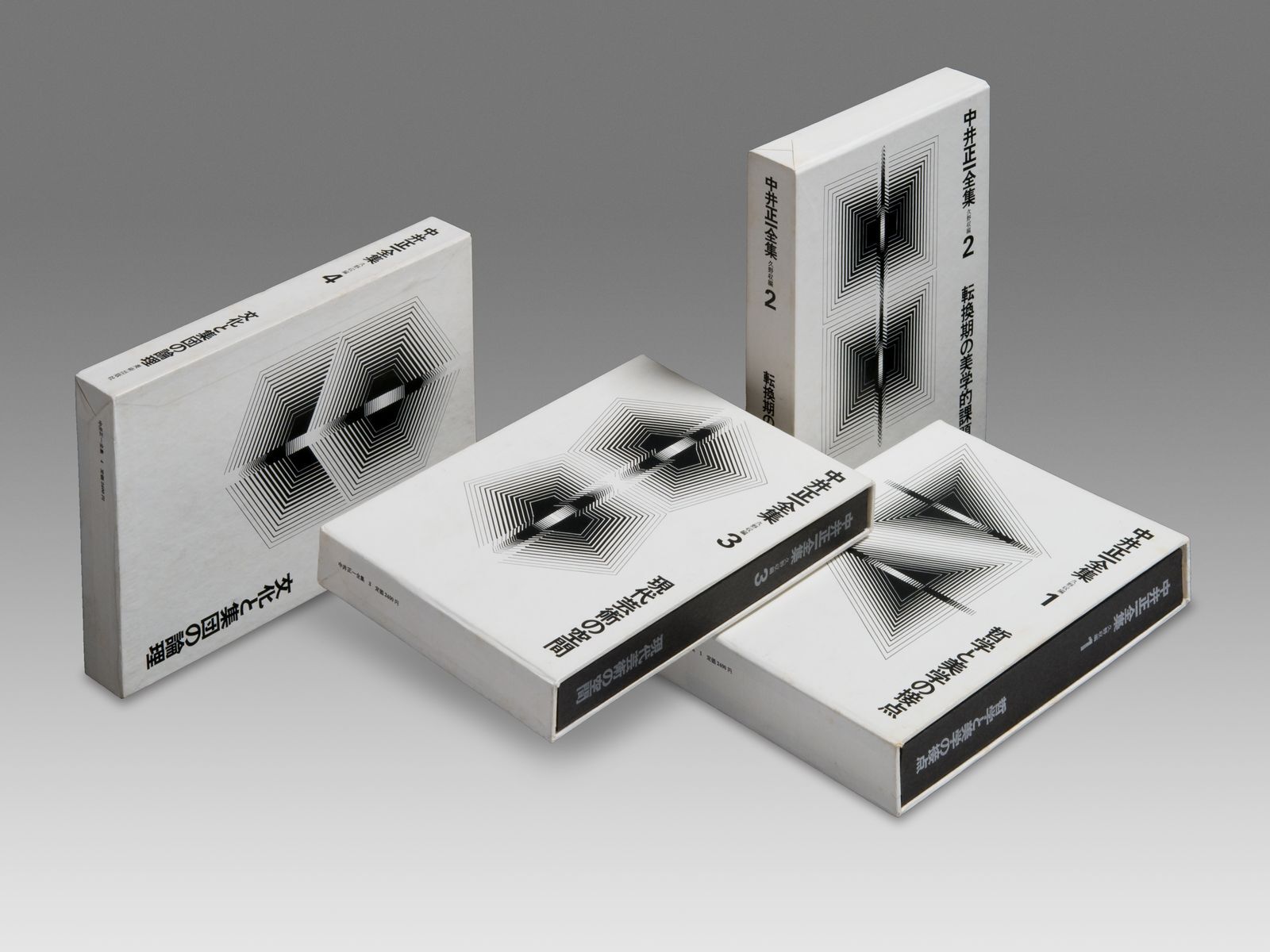 中心から外部へ、外部から中心へ……。白と黒が対立しあうオプティカル・パターンが、脈動するリズムを刻む。日本の文様をも連想させるこの幾何学的複合体は、著者が主張する、技術や生産の論理をふまえた新しい「集団的文化論」の在り方を象徴してゆらぎ、うつろい、巻ごとの変化をみせる。 二、ゆらぎ・うつろう シリーズ全集|(パターン)の変化で連続させる |