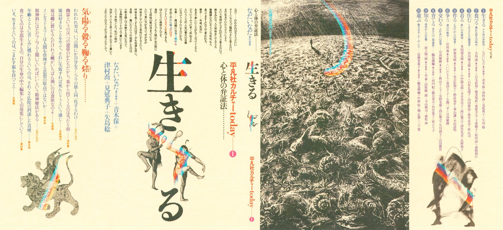 「10の動詞」をテーマとして編集された、10冊のディスカッション・ドラマ。多彩な論客たちが一堂に会し、1980年代初頭の日本社会のあり方を重層的な視点で切り取ってゆく。対論後の感想を記す、各人のエッセイが加えられた。カバーは、キ・アカ・アイの3色刷り。3色の刷り重ねで黒色を生みだす。この黒色(インクによる減色混合)から各色を削りだす独特の手法による「虹色の滲み」がカバーの表、背、裏など、随所に出没する。動詞テーマを生き生きと増殖させるイメージ(図版ページ)が本文ページに等間隔で挿入され、各冊の小口にリズミカルな繰り返しの黒オビ文様を出現させる。 デザイン協力=赤崎正一 二、ゆらぎ・うつろう シリーズ全集|(リズム)を生み出す カバー表紙|(表紙―背―裏表紙)図形+文字 カバー表紙|(色を削りだす)削り |