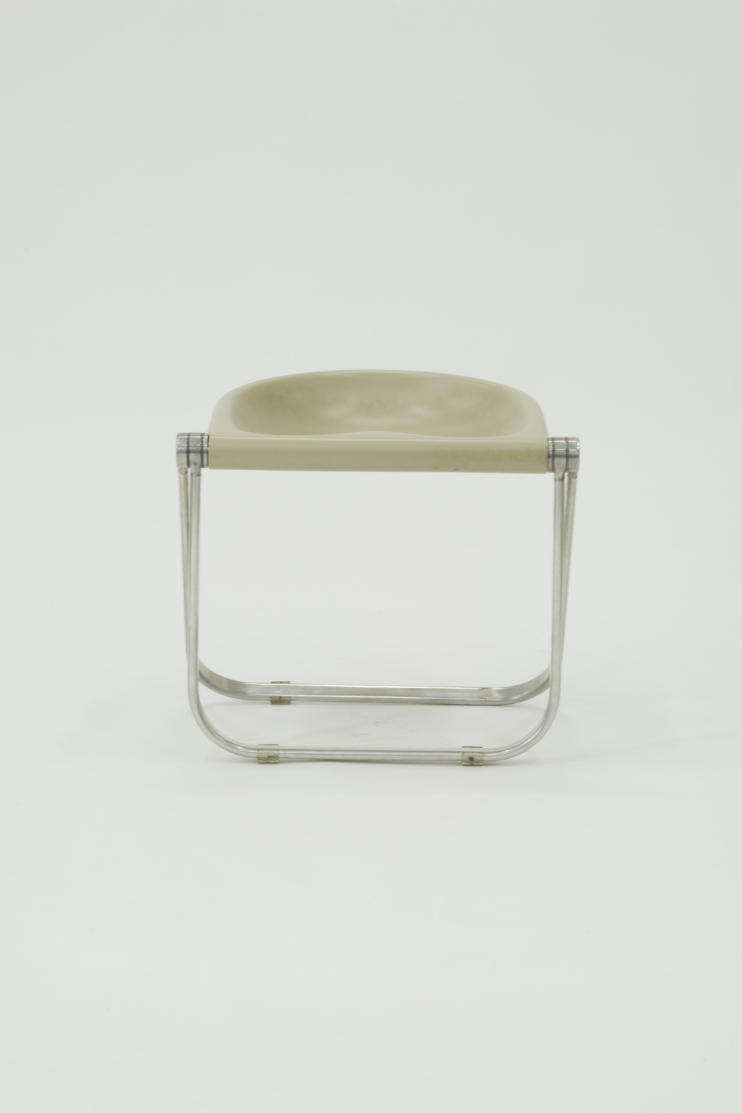 折り畳みスツールで座面の左右両端のアルミの鋳造のパーツの中に折り畳みの機構が全て集約されている。そのパーツに脚となる楕円形のスチールパイプを接合している。座って力のかかる方向とは逆方向に座面を回転させ、脚の中に収納されて大変コンパクトに納まる。このスツール以外にも同じアルミの材料を用いたサイドチェアもある。 |