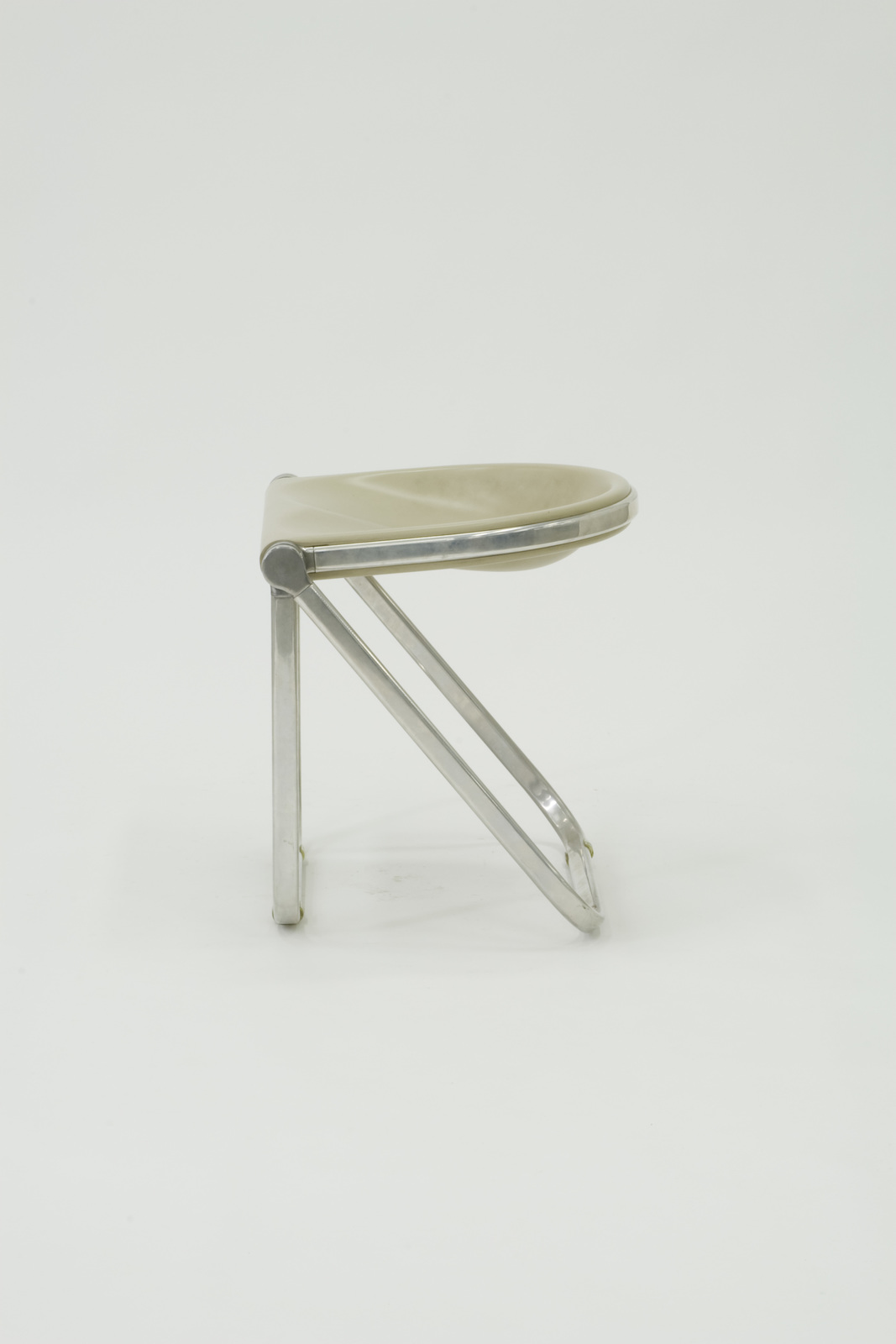 折り畳みスツールで座面の左右両端のアルミの鋳造のパーツの中に折り畳みの機構が全て集約されている。そのパーツに脚となる楕円形のスチールパイプを接合している。座って力のかかる方向とは逆方向に座面を回転させ、脚の中に収納されて大変コンパクトに納まる。このスツール以外にも同じアルミの材料を用いたサイドチェアもある。 |