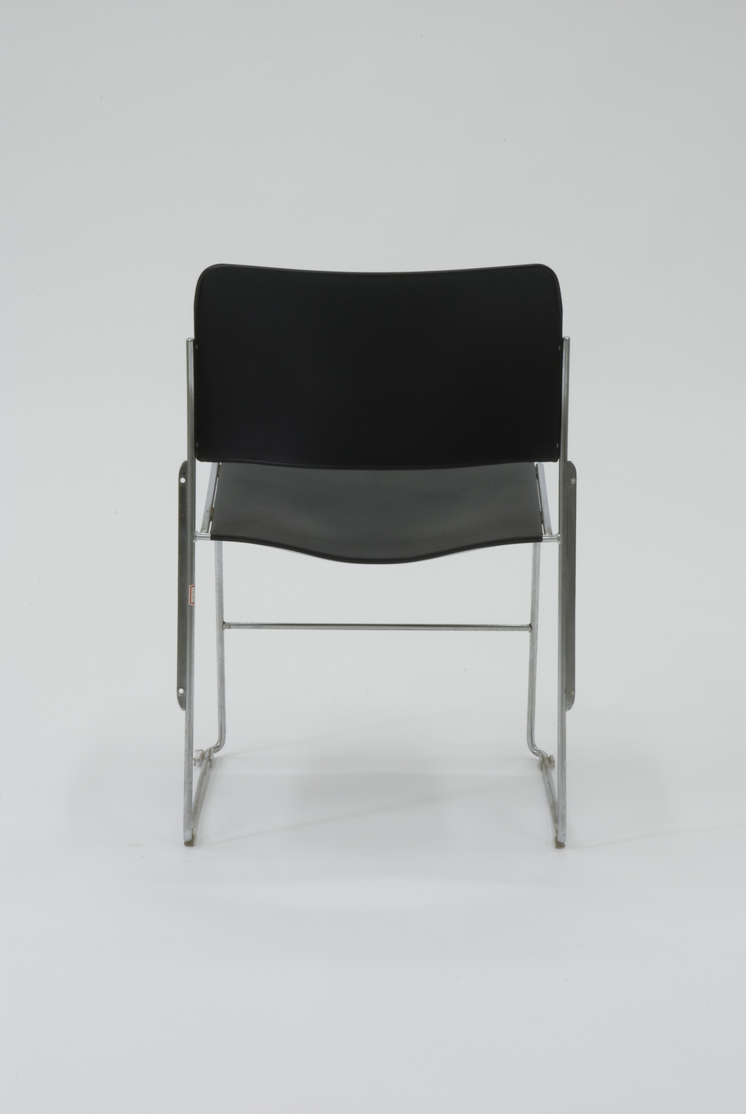 基本フレームがスチールロッドでできたスタッキングチェアである。背と座は2枚の薄い鉄板をプレス加工したもので、見た目の繊細さよりも重量がある。また機能面の特徴として、スタッキングだけでなく、連結もできる。重量はあるが、小さいアール加工もできるというスチールロッドのメリットが生かされた製品である。鉄板の背と座にマット状の塗装仕上げが加えられて、柔らかな感じを座る人に与えている。デイヴィット・ローランドはこの秀作以外にはあmり椅子をデザインしていない。 |
