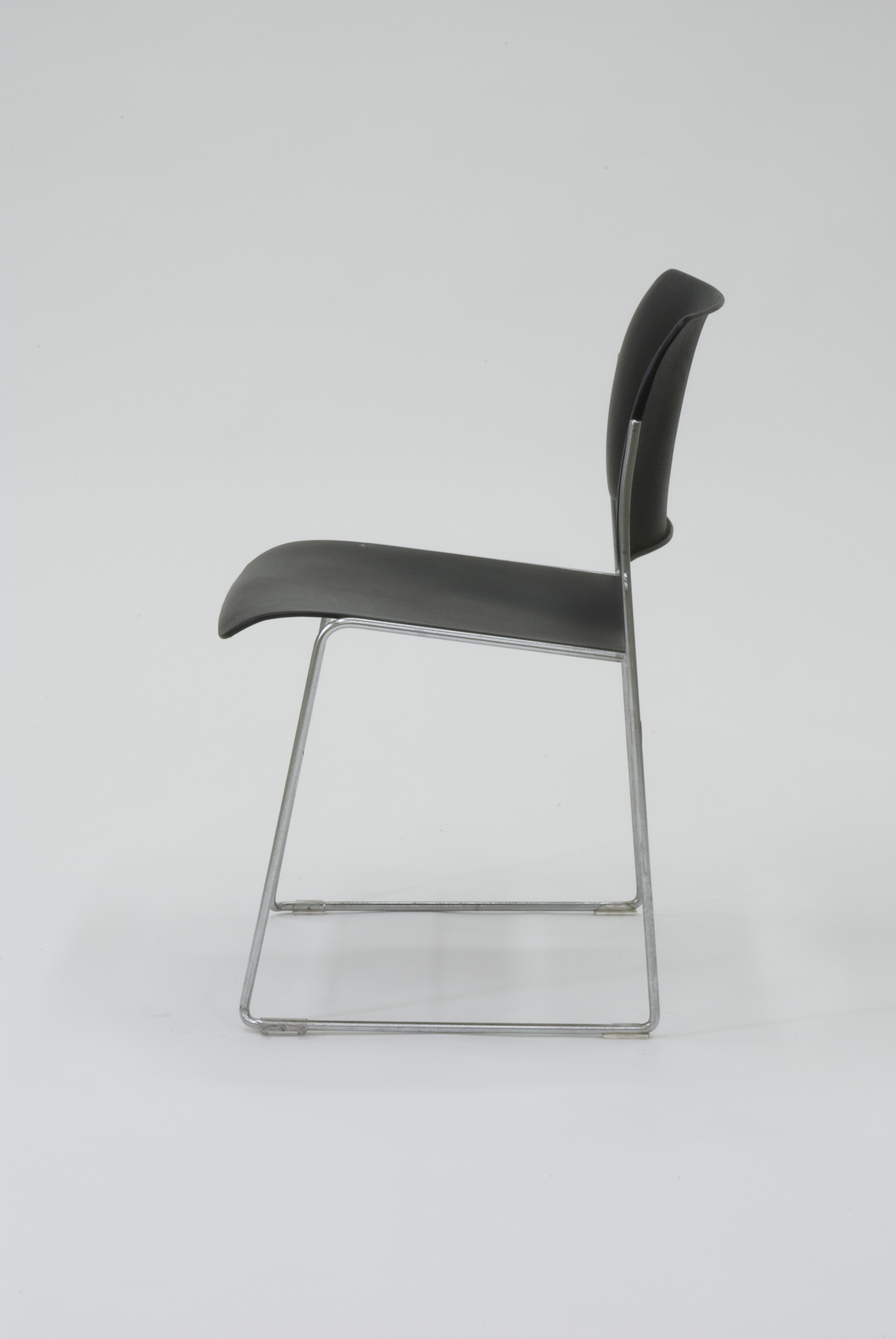 基本フレームがスチールロッドでできたスタッキングチェアである。背と座は2枚の薄い鉄板をプレス加工したもので、見た目の繊細さよりも重量がある。また機能面の特徴として、スタッキングだけでなく、連結もできる。重量はあるが、小さいアール加工もできるというスチールロッドのメリットが生かされた製品である。鉄板の背と座にマット状の塗装仕上げが加えられて、柔らかな感じを座る人に与えている。デイヴィット・ローランドはこの秀作以外にはあmり椅子をデザインしていない。 |