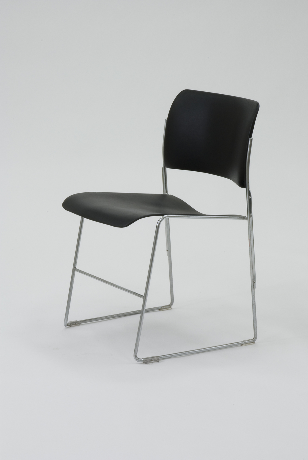 基本フレームがスチールロッドでできたスタッキングチェアである。背と座は2枚の薄い鉄板をプレス加工したもので、見た目の繊細さよりも重量がある。また機能面の特徴として、スタッキングだけでなく、連結もできる。重量はあるが、小さいアール加工もできるというスチールロッドのメリットが生かされた製品である。鉄板の背と座にマット状の塗装仕上げが加えられて、柔らかな感じを座る人に与えている。デイヴィット・ローランドはこの秀作以外にはあmり椅子をデザインしていない。 |