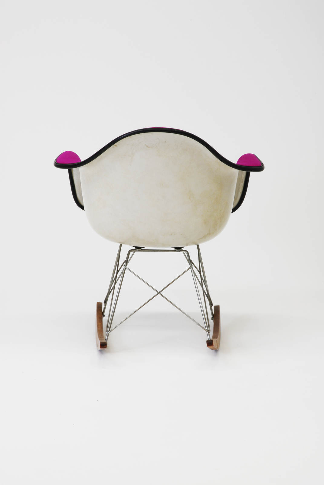 イームズのFRPシェルシリーズの1つであり、シェルは共通にして脚部を交換すれば椅子の機能、目的、表情が変化するバリエーションシステムである。少ないパーツで多くのアイテムを生む生産効率の良い方法である。シェルはFRPでそのまま使ったものもあり、また薄いウレタンに布を張り、周りにビニールを取り付けてシェルの縁に取り付けるタイプもある。この椅子の脚部は基本的にはスチールロッドの溶接による構成で、それにカバ材のロッカーをビスで取り付けロッキングチェアにしている。