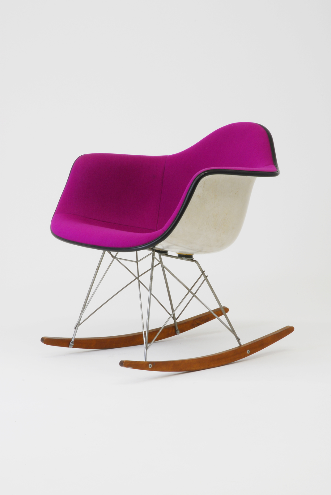 イームズのFRPシェルシリーズの1つであり、シェルは共通にして脚部を交換すれば椅子の機能、目的、表情が変化するバリエーションシステムである。少ないパーツで多くのアイテムを生む生産効率の良い方法である。シェルはFRPでそのまま使ったものもあり、また薄いウレタンに布を張り、周りにビニールを取り付けてシェルの縁に取り付けるタイプもある。この椅子の脚部は基本的にはスチールロッドの溶接による構成で、それにカバ材のロッカーをビスで取り付けロッキングチェアにしている。