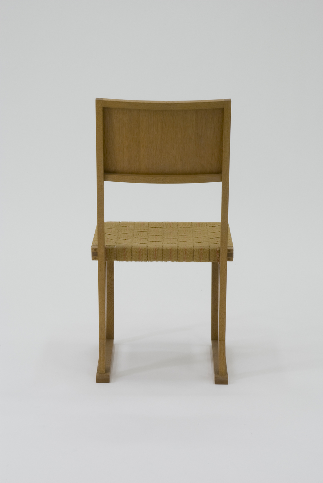当時日本が輸出していたインチ材といわれる規格寸法のナラ材を用いてつくられた椅子である。背と座と後脚を三角構造とすることで、構造上の補強が十分になされている。また座面は力布を市松に張り、シンプルで軽快なものとなっている。接地面の部分は畳の上でも使用できるように畳ずりが取り付けられている。 |