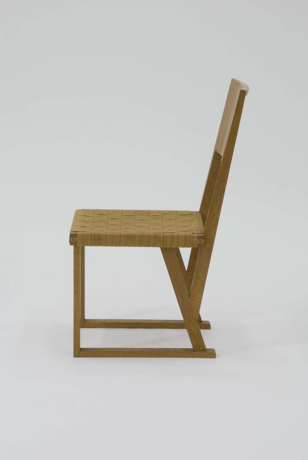 当時日本が輸出していたインチ材といわれる規格寸法のナラ材を用いてつくられた椅子である。背と座と後脚を三角構造とすることで、構造上の補強が十分になされている。また座面は力布を市松に張り、シンプルで軽快なものとなっている。接地面の部分は畳の上でも使用できるように畳ずりが取り付けられている。 |
