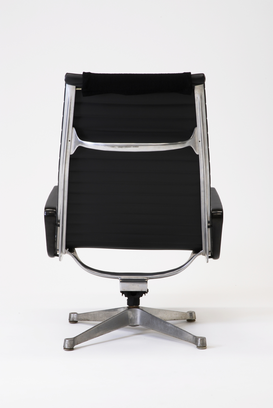 アルミニウムグループシリーズのハイバックチェアで、フレームの材料は主にアルミニウムである。この椅子もノックダウンシステムになっている。座面はビニールレザー(合成皮革)に発泡ウレタンが内蔵されてキルティング加工を施している。それをサイドフレームに巻き込み、さらに別のアルミニウムのパーツでおさえている。リクライニング機能も有し、座面の角度が変わる。共通パーツを用い合理的にできているシリーズである。薄い背と座のわりに、キルティングの感触と弾力によって、上質の座り心地を生み出している。 |