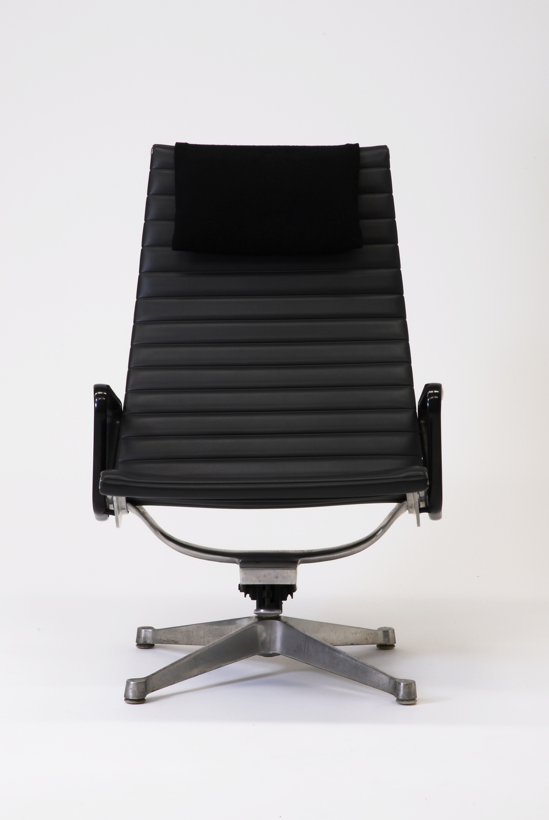 アルミニウムグループシリーズのハイバックチェアで、フレームの材料は主にアルミニウムである。この椅子もノックダウンシステムになっている。座面はビニールレザー(合成皮革)に発泡ウレタンが内蔵されてキルティング加工を施している。それをサイドフレームに巻き込み、さらに別のアルミニウムのパーツでおさえている。リクライニング機能も有し、座面の角度が変わる。共通パーツを用い合理的にできているシリーズである。薄い背と座のわりに、キルティングの感触と弾力によって、上質の座り心地を生み出している。 |