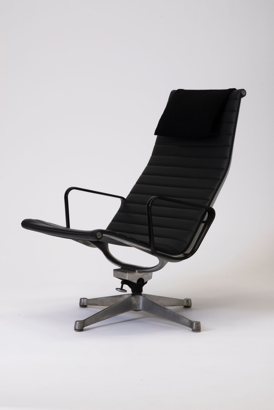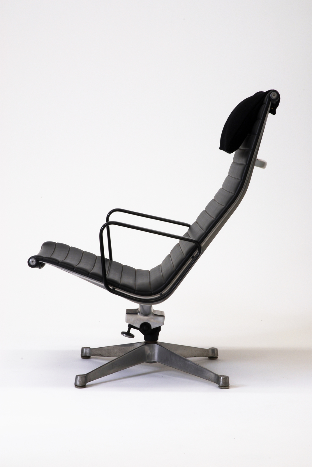 アルミニウムグループシリーズのハイバックチェアで、フレームの材料は主にアルミニウムである。この椅子もノックダウンシステムになっている。座面はビニールレザー(合成皮革)に発泡ウレタンが内蔵されてキルティング加工を施している。それをサイドフレームに巻き込み、さらに別のアルミニウムのパーツでおさえている。リクライニング機能も有し、座面の角度が変わる。共通パーツを用い合理的にできているシリーズである。薄い背と座のわりに、キルティングの感触と弾力によって、上質の座り心地を生み出している。 |