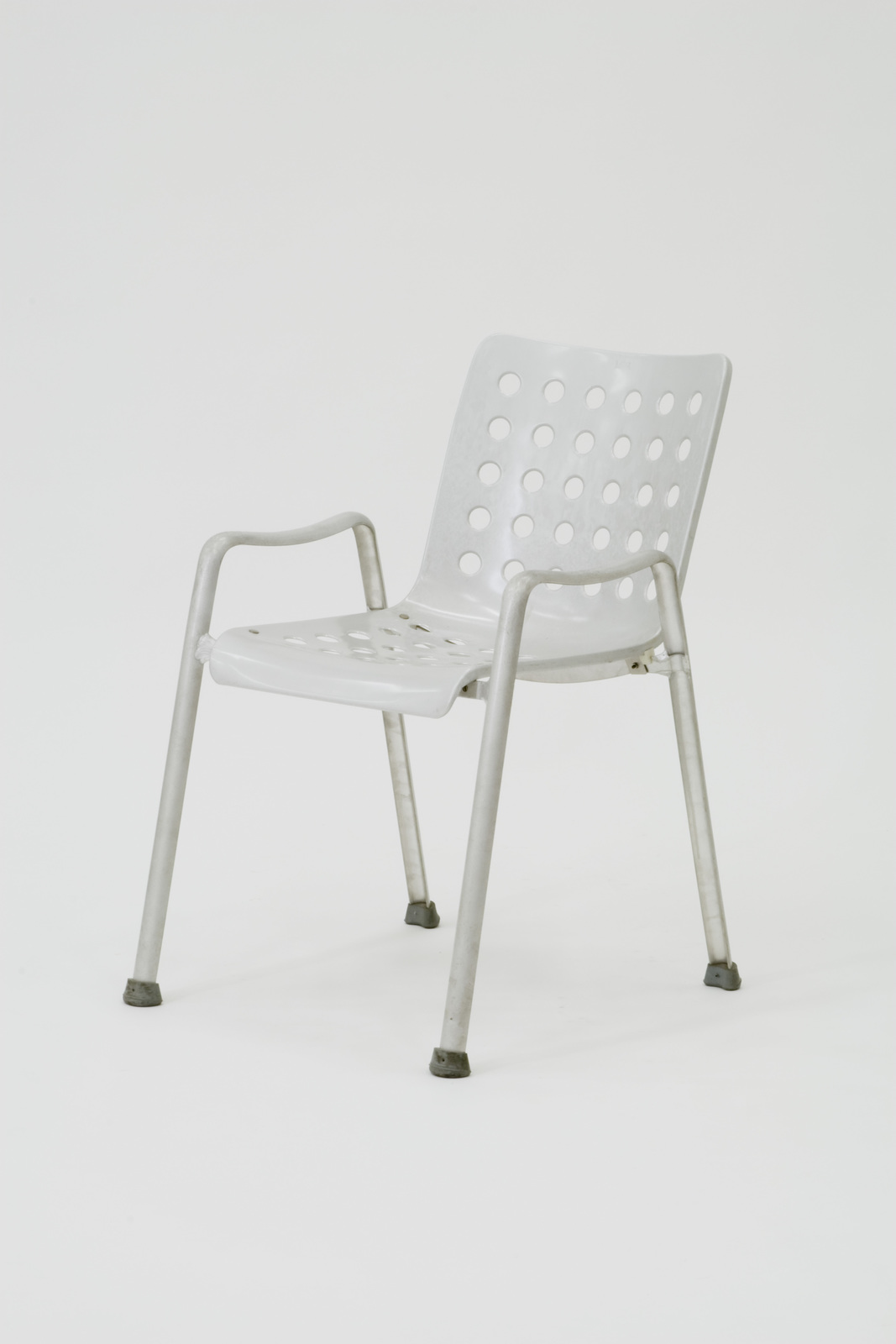 1939年チューリヒで開かれたスイス国内博(ランデスアウシュテルング)で公式椅子として使用されたことにちなんでこの名がつけられた。屋外に置く椅子のために、当時の新素材であるアルミニウムを使った初めての椅子である。座と背を一体で曲げてつくられている。全面にある穴は型抜きによって開けられていて、単に装飾効果や軽量化、雨水対策用だけでなく、プレスで打ち抜いたときに裏面に出るリブが、面に対して直角方向の構造体となって強度を増す役割を果たしている。足は断面をU字型にして強度を保とうとしているが、実際のプロポーションからすると、もう少し脚の幅を広げ「U」も大きくした方が安定性が良い。新しい金属素材としてアルゴン溶接によってのみ溶接が可能なアルミが生産された時代を象徴する記念碑的な椅子である。 |