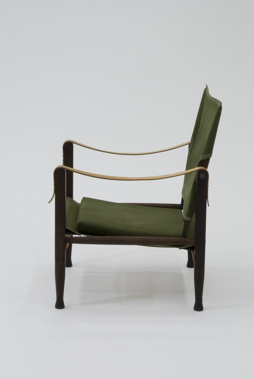 植民地に派遣されたイギリスの将校が使用した携帯、組立に簡便な椅子をヒントにして、コーア・クリントがリ・デザインしたものである。彼はデンマークの視点から見たイギリスの伝統を大切にし、なおかつ機能性も重視していた。リ・デザインされた「サファリ」も分解して運びやすくなっている。背と座は布張りと革張りの2種類で、アーム部分は革、脚はチーク、アッシュでできており、すべて分解したあと一つにまとめられて片手で軽く持てるほどに小さくなる。全体を軽くするために構造はとても単純である。接地面がたいらでなくてもそれなりに安定する軟らかい構造となっている。 |