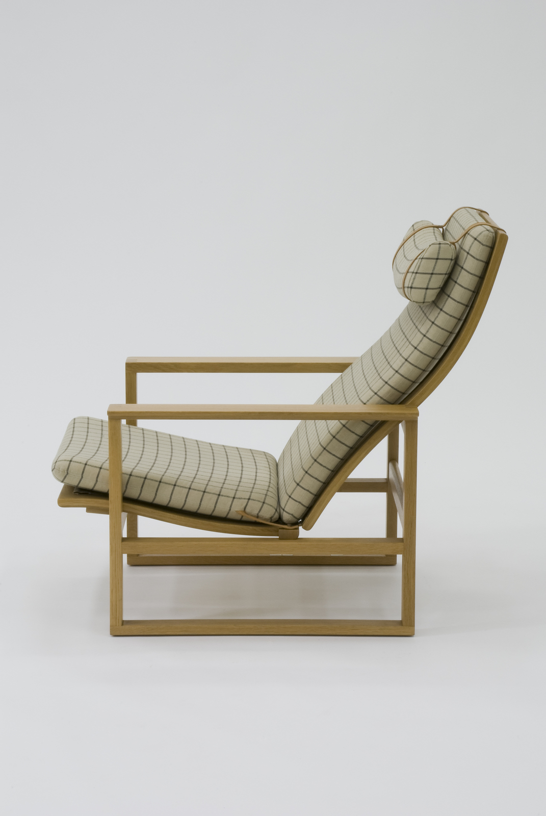 モーエンセンのシェーカーチェアやスパニッシュチェアに続く代表作である。一見シンプルな構造に見えるが、より安楽性を高めるためにリクライニング機構が備わっている。しかし決して複雑な構造でなく、蝶番によって接合された座と背をスライドさせる構造となっている。シンプルにすることによってコストをかけず、一般大衆を意識した彼の思想がこの椅子には反映されている。ハイバックの背の頭当てが、手軽く上下移動ができて、親しみが持てる椅子となっている。 |