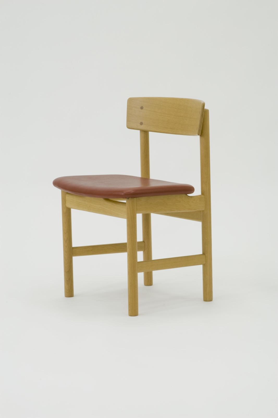 この椅子の原形はモーエンセンが1947年にデンマーク協同組合の家具部門「F.D.B」でデザインした「J39 シェーカーチェア」である。「F.D.B」からフリーになったのち、1956年に彼は「J39」の座を革張りにリデザインしてこの椅子をつくった。背の造形に対して座を革張りのフラットな面につくりあげたところに調和が見られる。この頃からモーエンセンは積極的に革を使いはじめ、スパニッシュチェアなど革とオークを様々な家具で組み合わせて用いている。この椅子は1956年以来今日まで生産されており、デンマークの庶民に永く支持され続けている。 |