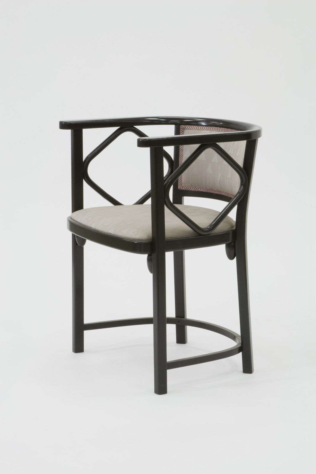 材質、構造についてはフレダーマウスとほぼ同じである。異なる点は背中の笠木が延長されアームになっており、そのアームには四辺形の補強材が入れられていることである。座枠と脚のとめ方は前脚と後脚を少し欠き込んで、その部分に座枠を差し込み、内側からボルト締めしたものである。そのためにずれない構造となっている。アームを補強する斜行した四角いパーツのジョイント部も木ねじが使用されている。なおこの椅子に使用されている特徴あるデザインの布地は、バックハウゼン社のものである。 |
