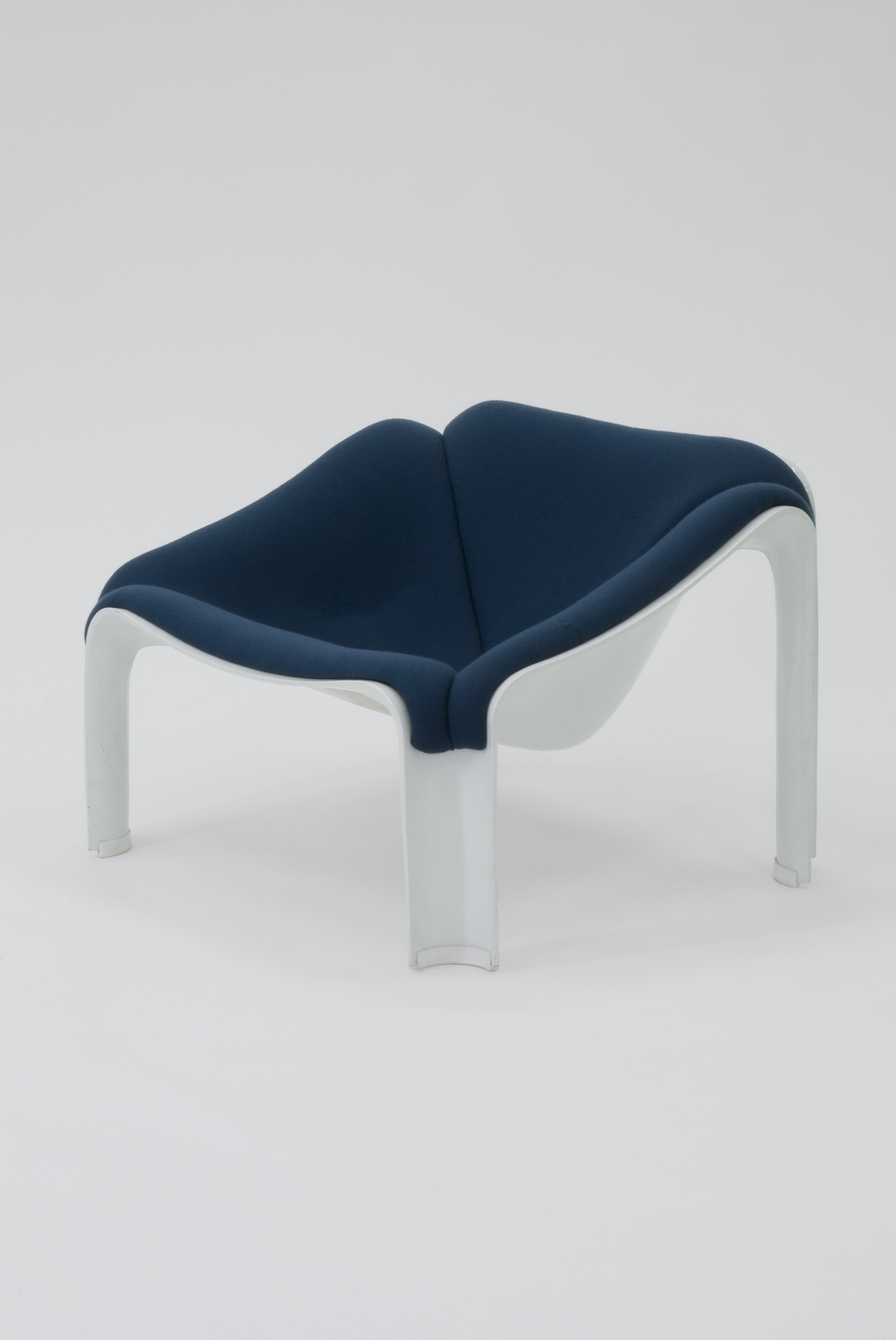 構造材はプレス加工によるFRPである。脚部は、断面のアール形状が太くなり、肉厚もあるので安定感があり丈夫である。しかしその分大変重く、強度に支障がでない程度にもう少し薄く、そして軽くできたら持ち運びやすいと思われる。FRPの本体には布張りのパッドが施されていて、それにウレタンを張り、更に布張りする仕組になっている。脚部の接地面には樹脂のキャップが差し込まれている。自由な曲面による有機的なデザインのチェアである。 |