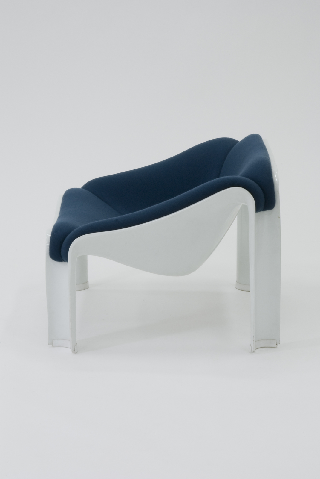 構造材はプレス加工によるFRPである。脚部は、断面のアール形状が太くなり、肉厚もあるので安定感があり丈夫である。しかしその分大変重く、強度に支障がでない程度にもう少し薄く、そして軽くできたら持ち運びやすいと思われる。FRPの本体には布張りのパッドが施されていて、それにウレタンを張り、更に布張りする仕組になっている。脚部の接地面には樹脂のキャップが差し込まれている。自由な曲面による有機的なデザインのチェアである。 |