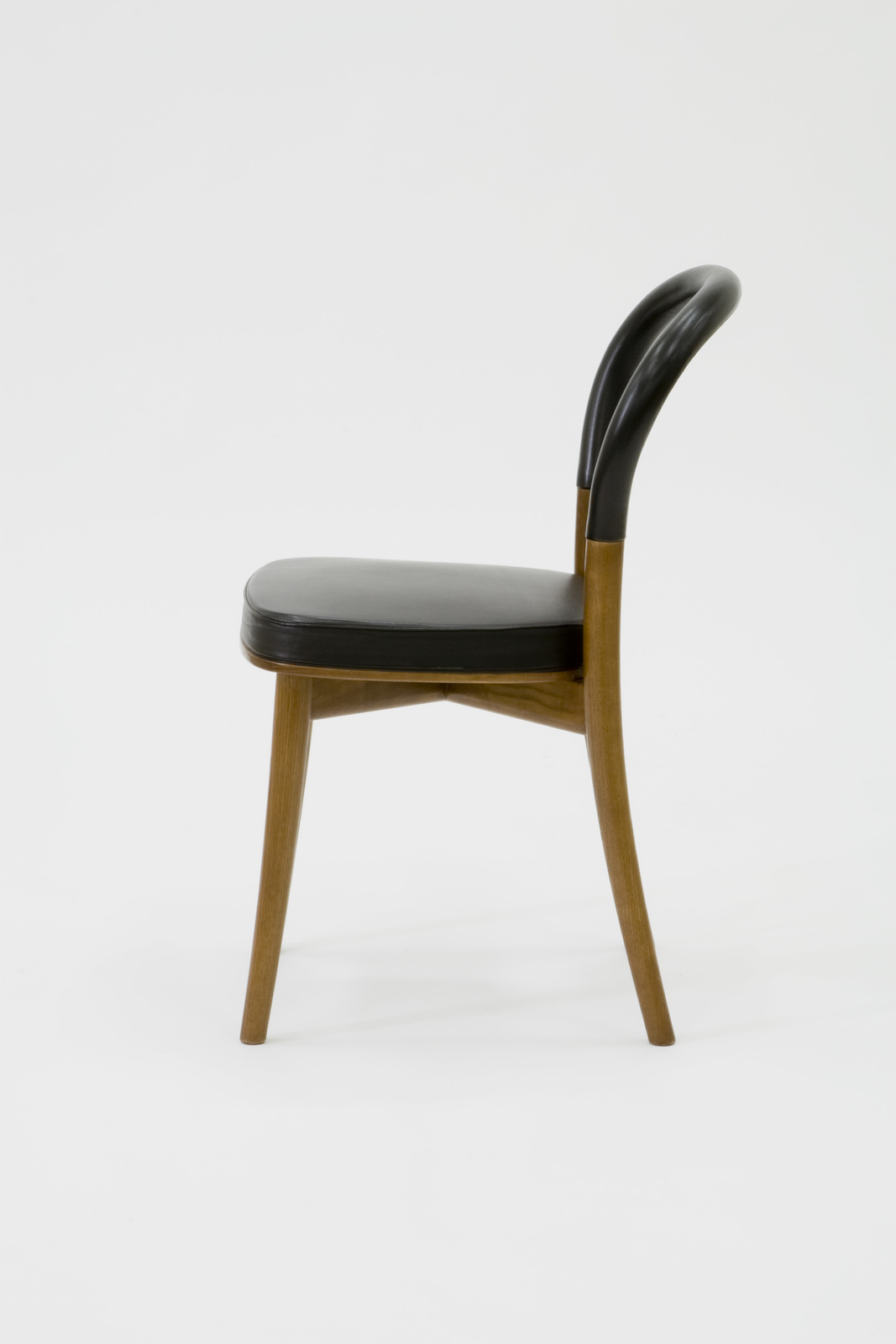 ヨーテボリにある裁判所のためにデザインされた椅子である。形態はシンプルで後ろ脚から笠木にかけて一体構造となっているフォルムは、まさにトーネットの影響を受けたものであろうが、笠木に曲木の技術が用いられているわけではない。この椅子はサイドビューに特徴があり後脚から笠木にかけてのラインがとても美しく、笠木の部分における革の張り方や革の終わるところの納まり方に対する神経の使い方は見るべきものがある。座枠はクロスさせた貫の上に載せており、その交点はダボでとめられ、長い一本の材と短い二本の材で構成されている。見かけより構造的にしっかりした椅子である。 |