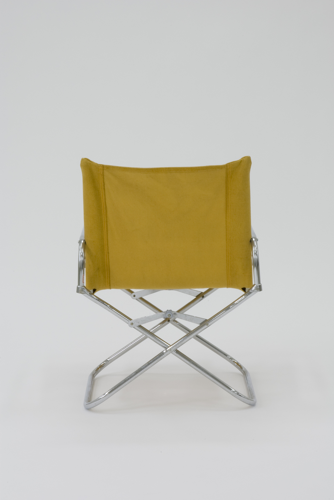 1975年にデザインされたアームも脚も金属でつくられた折り畳み椅子。脚が交差し、背と座がキャンバスなのは今までと同じだが、加重による広がりを安定させるために脚の交差するところにステイを入れている。折り畳む場合にステイを更に折る手順は煩雑を免れない。アームを折り畳むというところに問題点があろう。