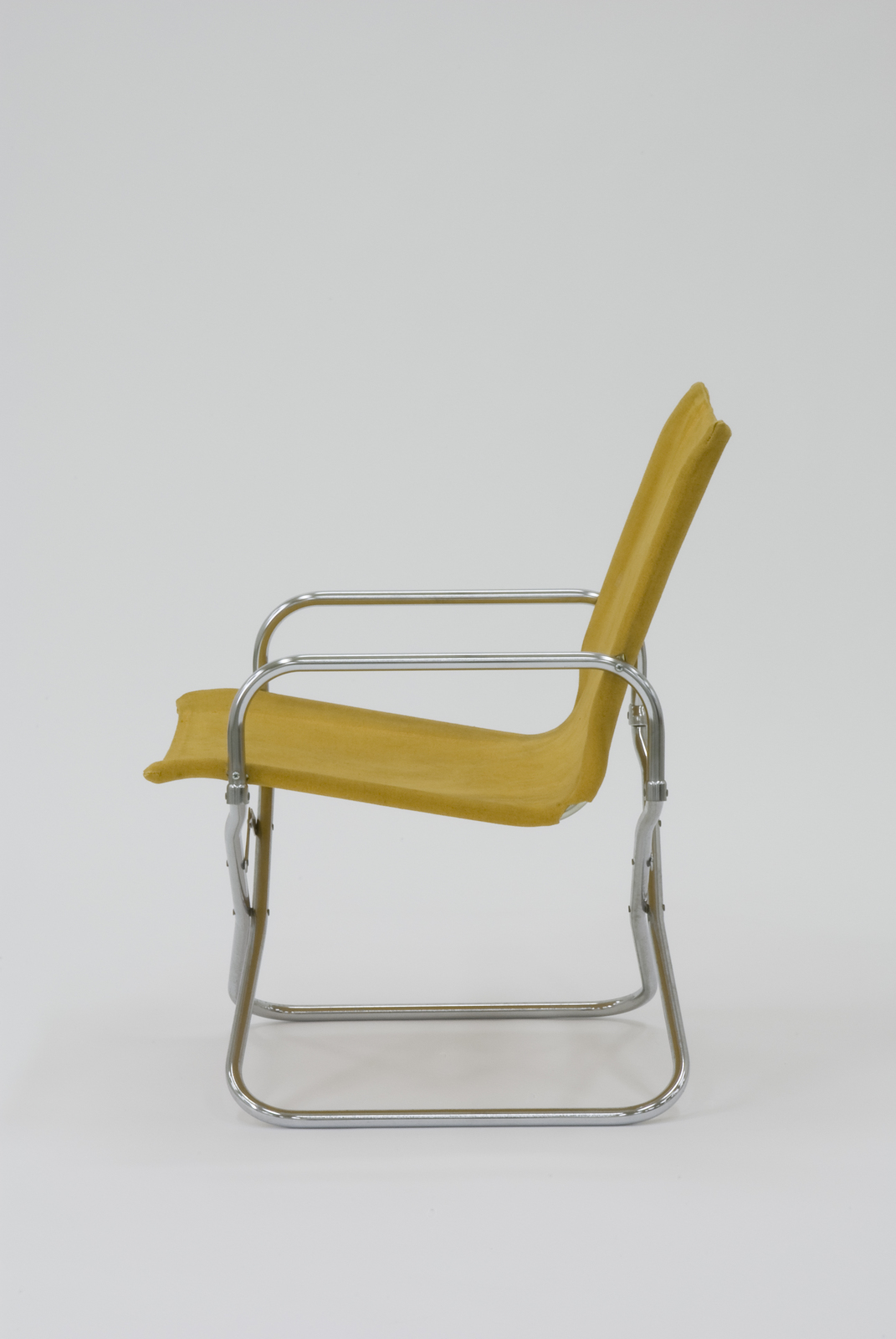 1975年にデザインされたアームも脚も金属でつくられた折り畳み椅子。脚が交差し、背と座がキャンバスなのは今までと同じだが、加重による広がりを安定させるために脚の交差するところにステイを入れている。折り畳む場合にステイを更に折る手順は煩雑を免れない。アームを折り畳むというところに問題点があろう。
