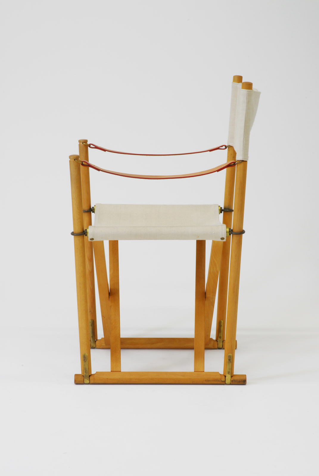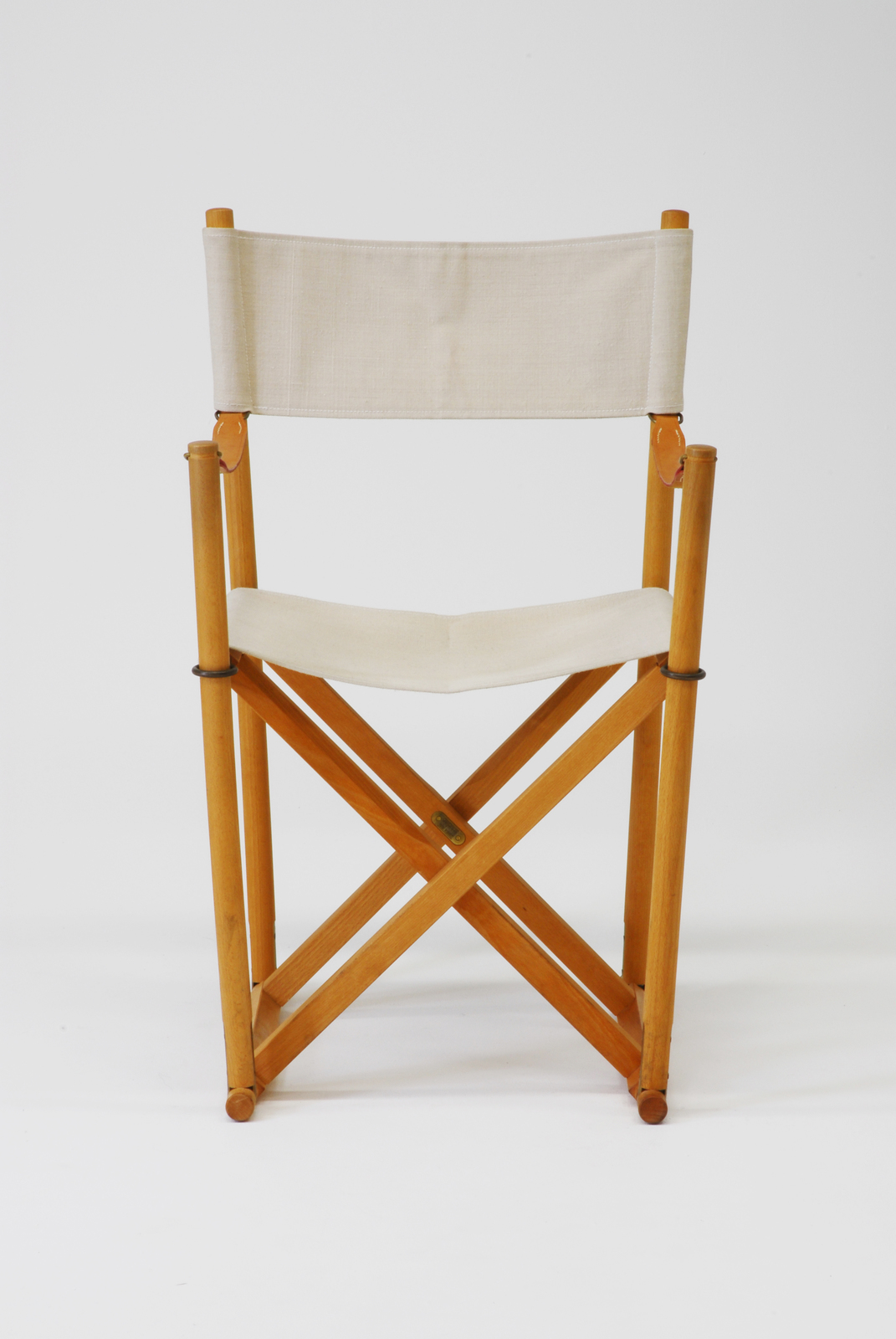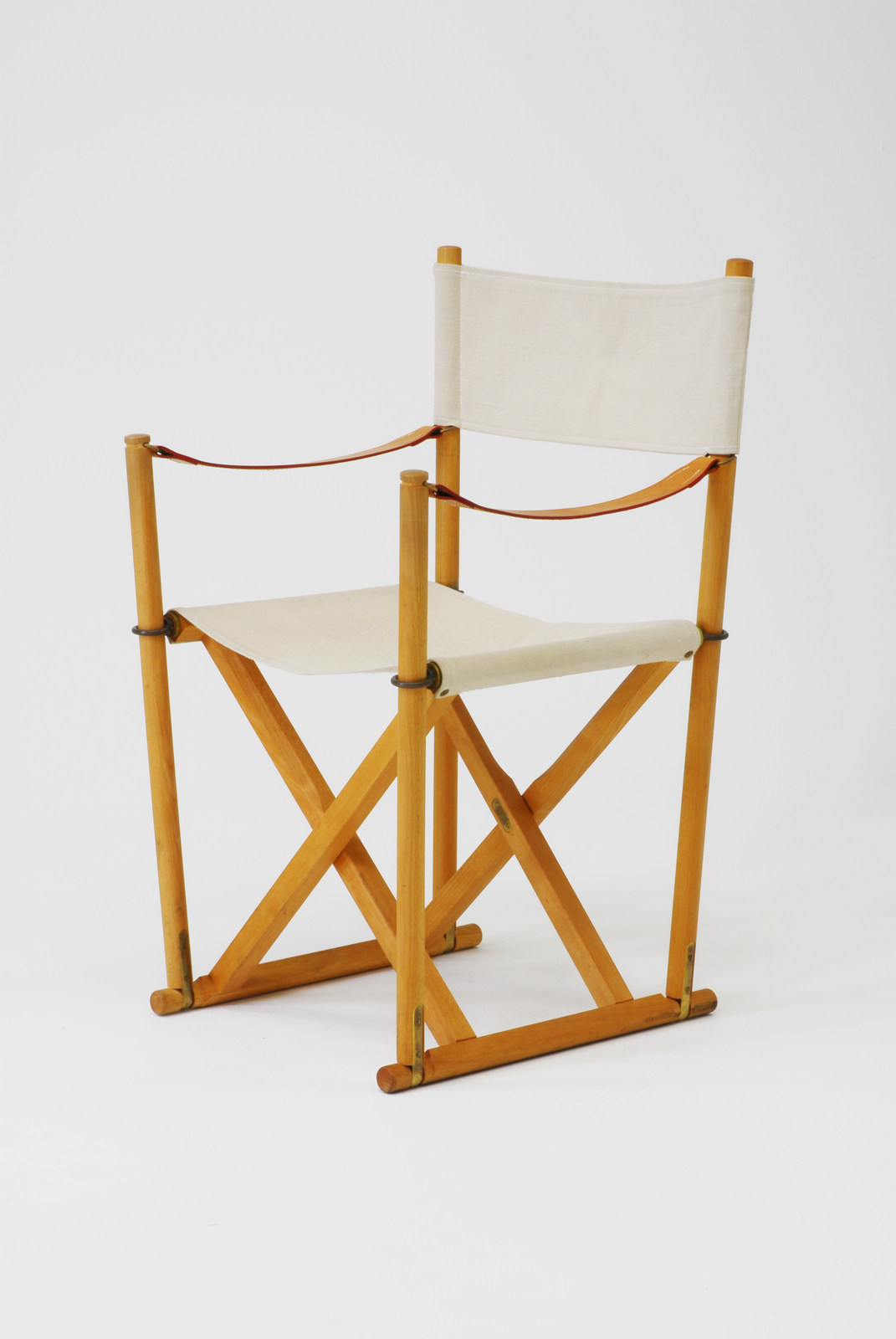 座面の四隅にあるリングが前脚と後脚に沿って上下して折り畳まれる椅子である。特徴的な構造は左右脚をつなぐX状のステーの先端にあるリングが折りたたまれるに従って回転するようになっていて、極めて独創的な折り畳み構造である。折り畳んだ椅子はコンパクトに納まり、軽くて持ち運びやすくなっている。また折り畳んだ姿で自立もできる。1932年のコペンハーゲン家具職人組合による「小住宅のための家具」コンペで一等に入選した。当時としてはあまりにも画期的な構造のため商品化されなかったが、1960年にデンマークのインテルナ社で製造され、今日ではルド・ラスムッセン社でつくられている。 |