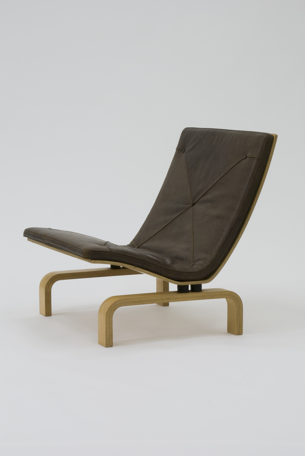 金属と木材、または金属と革という人工素材と良質の天然素材との対比で美しい家具を生み出してきたポール・ケアホルムが、成形合板と革とを組み合わせた家具づくりに着手したデザイン。大振りの休息用の椅子でありながら背と座を1枚の成形合板でつくり、古典的な技法であるボタンじめのクッションをのせている。脚は逆U字型にして座と背の間に1本の貫を入れ、きわめて細い間で座と脚をつけている。このジョイントの部分に彼が終生尊敬していたミース・ファン・デル・ローエやチャールズ・イームズの影を見ることができる。 |