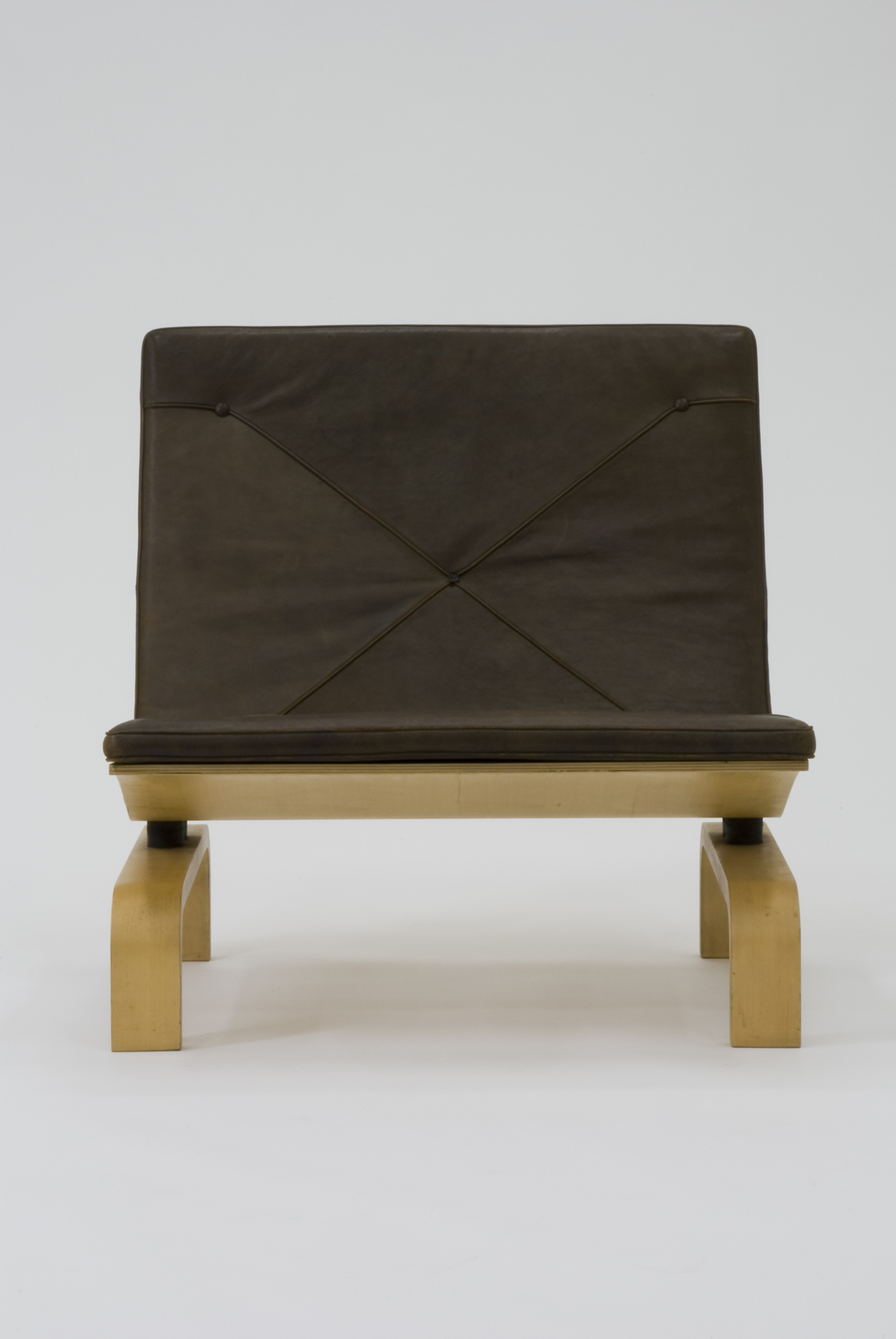 金属と木材、または金属と革という人工素材と良質の天然素材との対比で美しい家具を生み出してきたポール・ケアホルムが、成形合板と革とを組み合わせた家具づくりに着手したデザイン。大振りの休息用の椅子でありながら背と座を1枚の成形合板でつくり、古典的な技法であるボタンじめのクッションをのせている。脚は逆U字型にして座と背の間に1本の貫を入れ、きわめて細い間で座と脚をつけている。このジョイントの部分に彼が終生尊敬していたミース・ファン・デル・ローエやチャールズ・イームズの影を見ることができる。 |