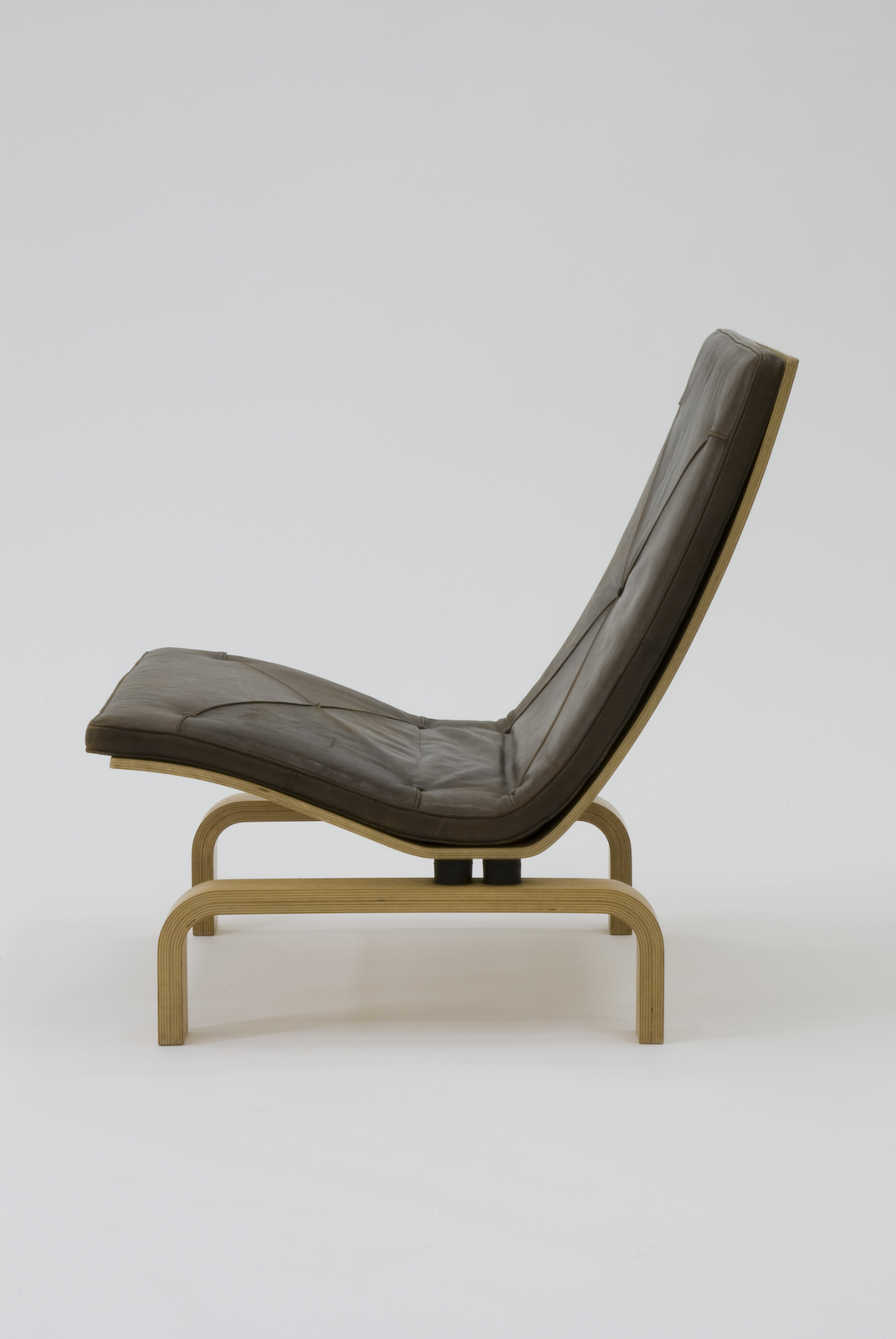 金属と木材、または金属と革という人工素材と良質の天然素材との対比で美しい家具を生み出してきたポール・ケアホルムが、成形合板と革とを組み合わせた家具づくりに着手したデザイン。大振りの休息用の椅子でありながら背と座を1枚の成形合板でつくり、古典的な技法であるボタンじめのクッションをのせている。脚は逆U字型にして座と背の間に1本の貫を入れ、きわめて細い間で座と脚をつけている。このジョイントの部分に彼が終生尊敬していたミース・ファン・デル・ローエやチャールズ・イームズの影を見ることができる。 |
