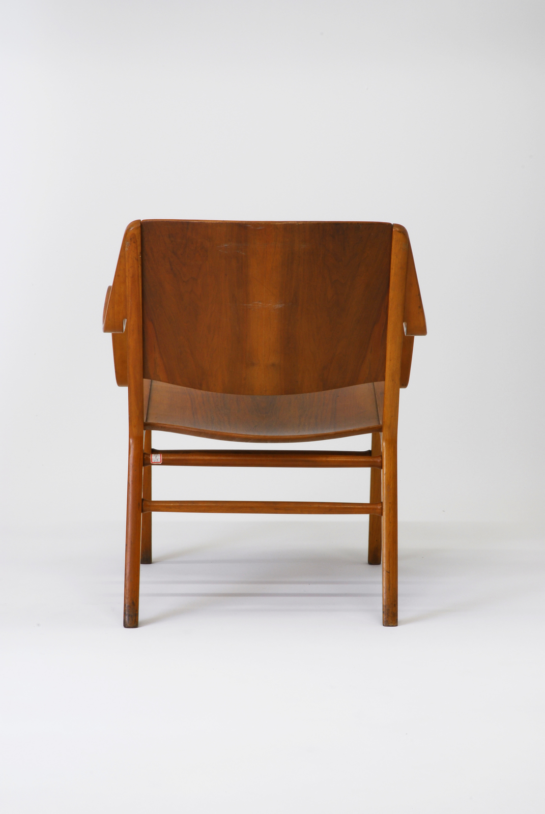 成型合板の椅子としては、きわめて初期ににできたものである。すべてが単純な成型合板でできているように見えるが、それは背と座だけで、他の部分は色々なアイデアによってつくられた椅子である。この椅子はノックダウン(組立式)になっており、脚にナットがインサートされており、貫は逆ネジになっている。座と背を左右の脚フレームで挟みながら4本の貫を回転させて組み立てる仕組になっている。脚は駒を入れて成形する駒入れ成形(ラケット構造)になっている。成型合板によって新しい技術と構造を生み出した椅子である。 |