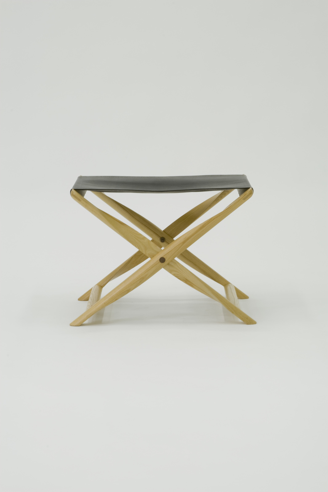 アフリカの民芸品に折り畳むとその脚のそれぞれの部材が一本の丸棒となるスツールがあった。その脚は木製でプロペラ状に削られていた。コーレ・クリントがこれを今日的な技術や考えのもとで、リ・デザインしたのがこのプロペラスツールである。トネリコ材を使用し、X型のフレームのところをプロペラ状に削りだしている。また貫の部分は半円状となっており、両方とも折り畳むと丸棒になる。フレームが丸棒になることによって美しく納まり、持ちやすく軽くて移動しやすいスツールである。座面の革の茶色と柔らかな質感が脚材のトネリコの対比的な調和が美しい。 |