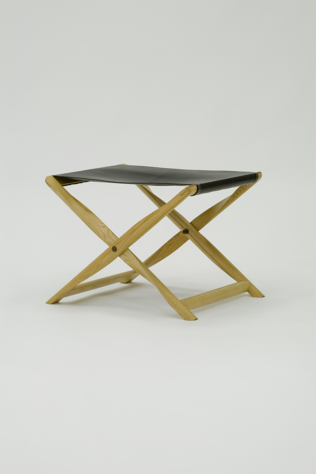 アフリカの民芸品に折り畳むとその脚のそれぞれの部材が一本の丸棒となるスツールがあった。その脚は木製でプロペラ状に削られていた。コーレ・クリントがこれを今日的な技術や考えのもとで、リ・デザインしたのがこのプロペラスツールである。トネリコ材を使用し、X型のフレームのところをプロペラ状に削りだしている。また貫の部分は半円状となっており、両方とも折り畳むと丸棒になる。フレームが丸棒になることによって美しく納まり、持ちやすく軽くて移動しやすいスツールである。座面の革の茶色と柔らかな質感が脚材のトネリコの対比的な調和が美しい。 |