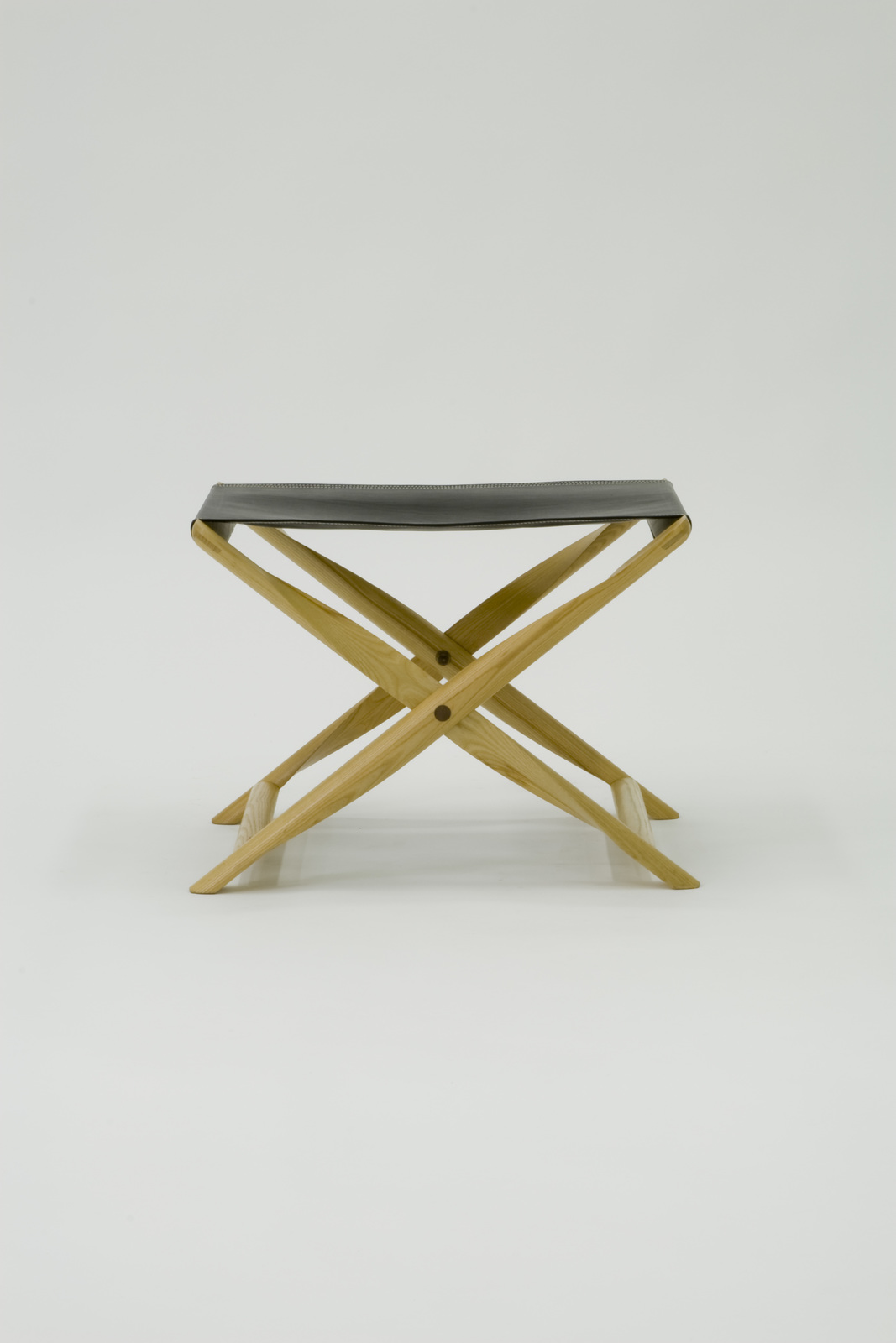 アフリカの民芸品に折り畳むとその脚のそれぞれの部材が一本の丸棒となるスツールがあった。その脚は木製でプロペラ状に削られていた。コーレ・クリントがこれを今日的な技術や考えのもとで、リ・デザインしたのがこのプロペラスツールである。トネリコ材を使用し、X型のフレームのところをプロペラ状に削りだしている。また貫の部分は半円状となっており、両方とも折り畳むと丸棒になる。フレームが丸棒になることによって美しく納まり、持ちやすく軽くて移動しやすいスツールである。座面の革の茶色と柔らかな質感が脚材のトネリコの対比的な調和が美しい。 |