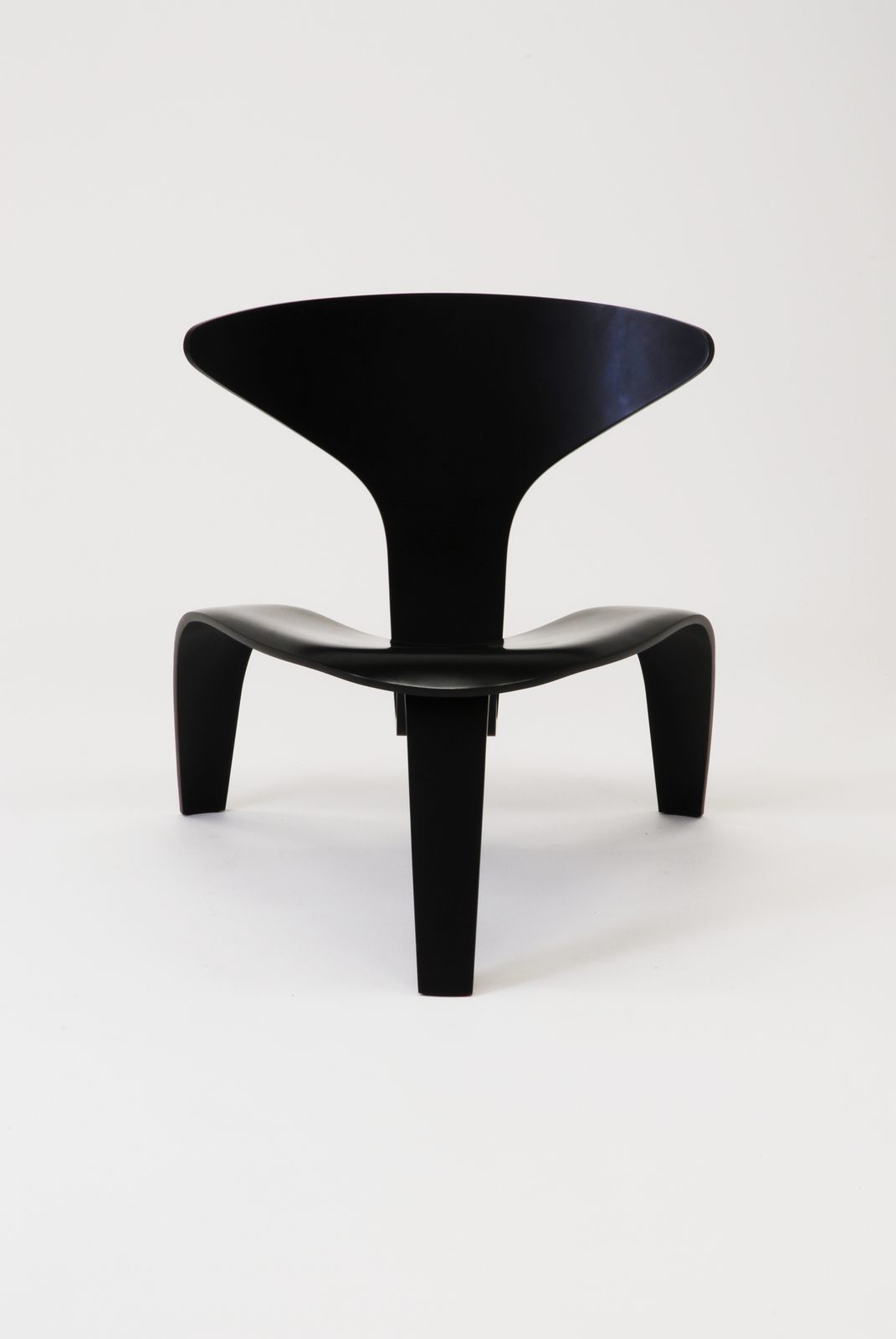 この椅子は2片の3次曲線の成形合板でできている。前脚から背につながる部材と、座面から後脚につながる2つの部材からなり、その2つの部材は座面の下で接合されている。2つの部材の接合部分にはケアホルムが私淑したイームズによる「DCW」と同じゴムとボルトナットのデティールを活用している。この椅子はポール・ケアホルムがフリッツ・ハンセン社のデザイン部門のスタッフであったときにデザインしたもので、当時の技術では強度に問題があり生産できなかったが、1997年にフリッツ・ハンセン社の創立125年を記念して限定ナンバー付きで生産された。当時としては大変ユニークなフォルムをしており、また現在でも決して古さを感じさせないデザインである。 |
