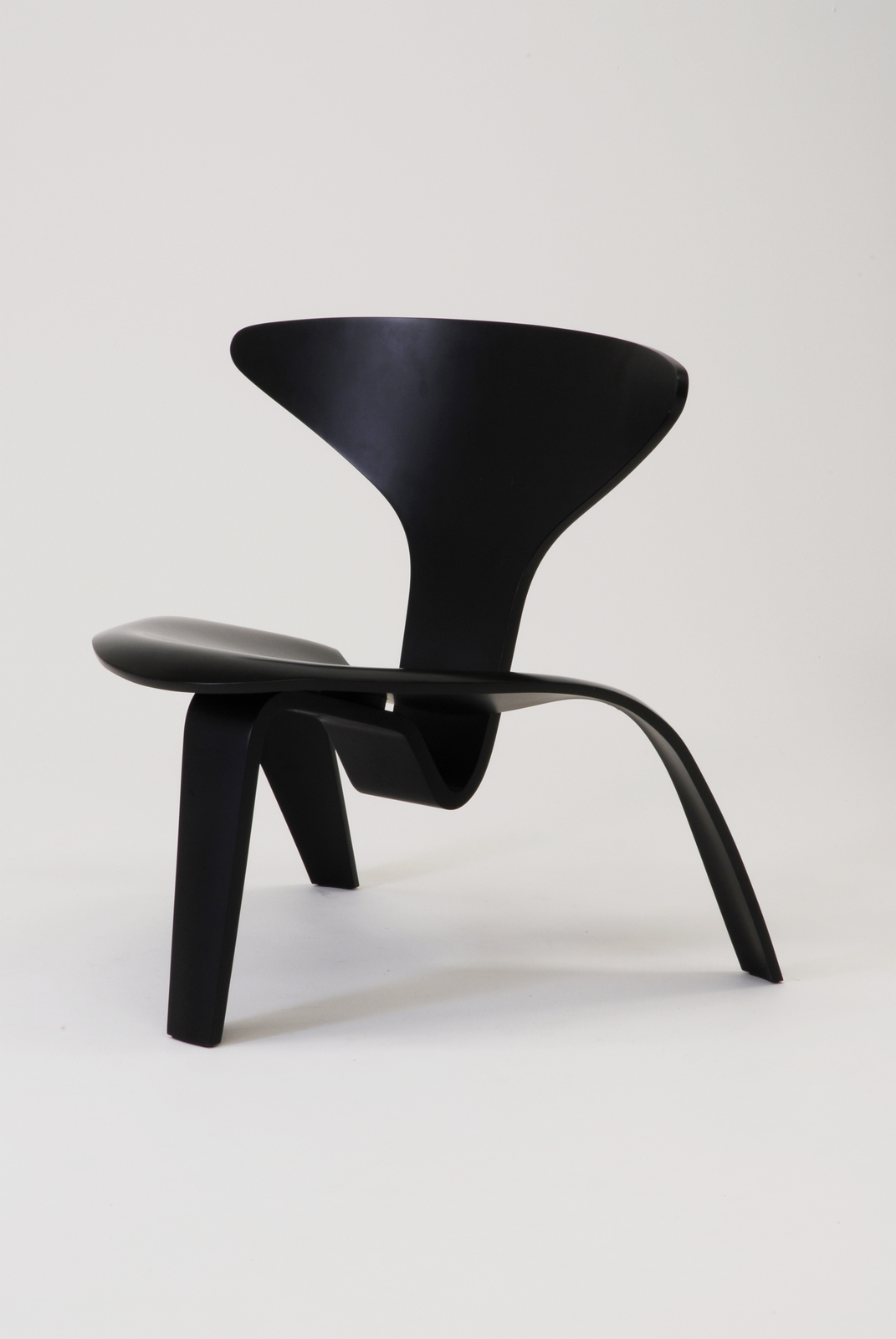 この椅子は2片の3次曲線の成形合板でできている。前脚から背につながる部材と、座面から後脚につながる2つの部材からなり、その2つの部材は座面の下で接合されている。2つの部材の接合部分にはケアホルムが私淑したイームズによる「DCW」と同じゴムとボルトナットのデティールを活用している。この椅子はポール・ケアホルムがフリッツ・ハンセン社のデザイン部門のスタッフであったときにデザインしたもので、当時の技術では強度に問題があり生産できなかったが、1997年にフリッツ・ハンセン社の創立125年を記念して限定ナンバー付きで生産された。当時としては大変ユニークなフォルムをしており、また現在でも決して古さを感じさせないデザインである。 |