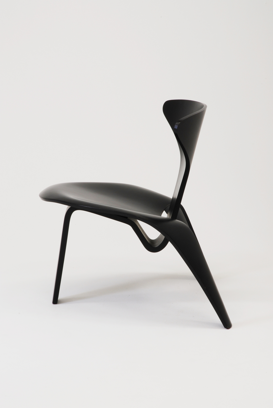 この椅子は2片の3次曲線の成形合板でできている。前脚から背につながる部材と、座面から後脚につながる2つの部材からなり、その2つの部材は座面の下で接合されている。2つの部材の接合部分にはケアホルムが私淑したイームズによる「DCW」と同じゴムとボルトナットのデティールを活用している。この椅子はポール・ケアホルムがフリッツ・ハンセン社のデザイン部門のスタッフであったときにデザインしたもので、当時の技術では強度に問題があり生産できなかったが、1997年にフリッツ・ハンセン社の創立125年を記念して限定ナンバー付きで生産された。当時としては大変ユニークなフォルムをしており、また現在でも決して古さを感じさせないデザインである。 |