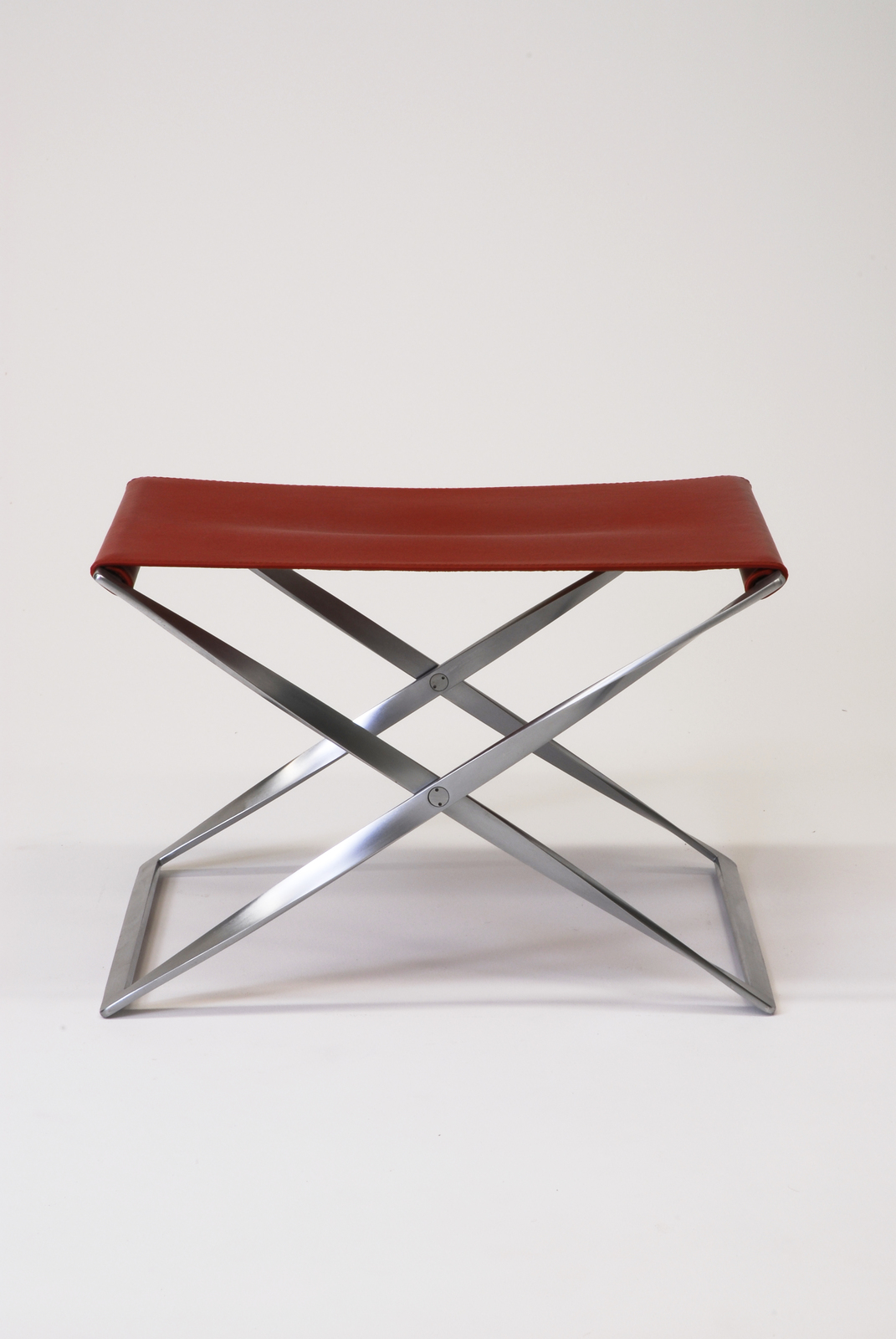 コーレ・クリントの木製のプロペラスツールをリ・デザインしたもの。スチールの平板をねじることによって回転軸を取り付けることができ、折りたたんだ時にそのねじられた平板が美しく重なり合うようになっている。この回転軸はボールベアリングを使用し、大変スムーズに折り畳むことができる。さらにこの椅子をリデザインした椅子にヨルゲン・ガメルゴーの折り畳み椅子がある。良質で仕上がりの良い工業製品のスチールと自然素材の皮革という取り合わせによって生み出される豊かな雰囲気はケアホルムが踏襲するミース・ファン・デル・ローエが得意とする手法のひとつ。見た目に比べて意外に重量があることに驚かされる。 |
