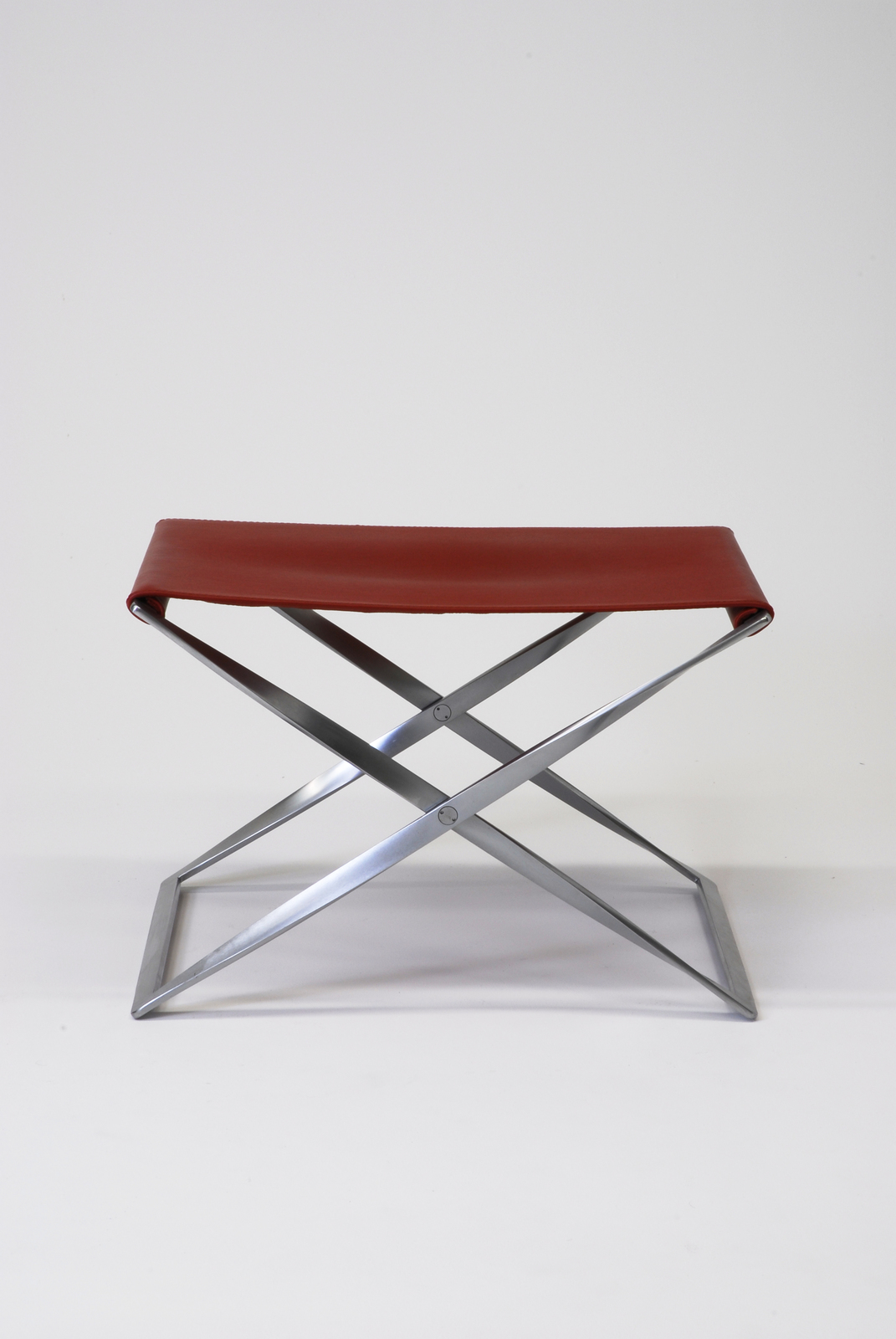 コーレ・クリントの木製のプロペラスツールをリ・デザインしたもの。スチールの平板をねじることによって回転軸を取り付けることができ、折りたたんだ時にそのねじられた平板が美しく重なり合うようになっている。この回転軸はボールベアリングを使用し、大変スムーズに折り畳むことができる。さらにこの椅子をリデザインした椅子にヨルゲン・ガメルゴーの折り畳み椅子がある。良質で仕上がりの良い工業製品のスチールと自然素材の皮革という取り合わせによって生み出される豊かな雰囲気はケアホルムが踏襲するミース・ファン・デル・ローエが得意とする手法のひとつ。見た目に比べて意外に重量があることに驚かされる。 |