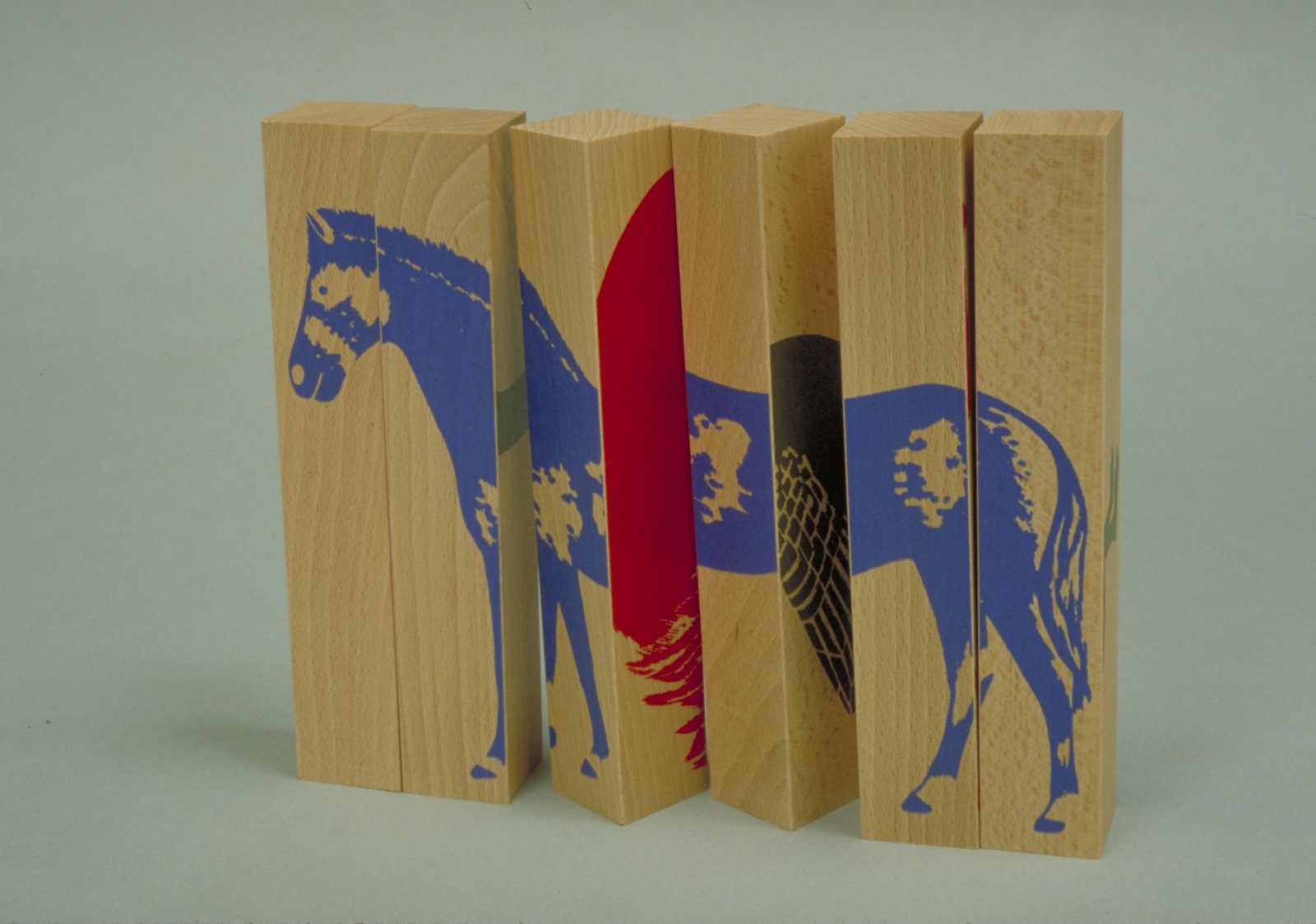 35mm角の積み木を使ったパターン遊び。4種類の動物(ウマ・イヌ・ニワトリ・カモ)ができる。適応年齢:3+