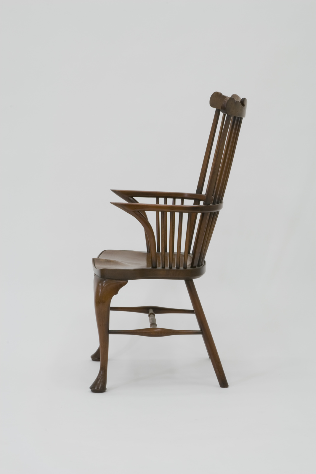 ウィンザー・チェアのなかでも最も古くからある型のひとつは、平行に並ぶスポークで構成された背を水平板でできた笠木でとめるコムバックであるが、そのコムバックの背の強度をさらに高めるために、スポークを座面から笠木に向かって扇状に配したタイプがこのファンバックである。前脚には優雅さと安定感を演出するためにキャブリオレと呼ばれるチッペンデール様式のフォルムが用いられているが、この部分がアノニマスデザインと様式家具の融合から誕生したデザインを象徴しているといえよう。